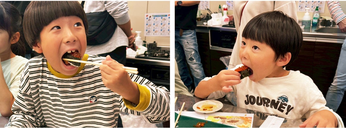 今回は、まぐろ、サーモン、たまごといった人気のにぎりに加え、いくら(軍艦)とえびてまりの計5貫を作りました。自身でにぎったお寿司を食べ、「おいしかっぱ!」と笑顔が溢れていました。
