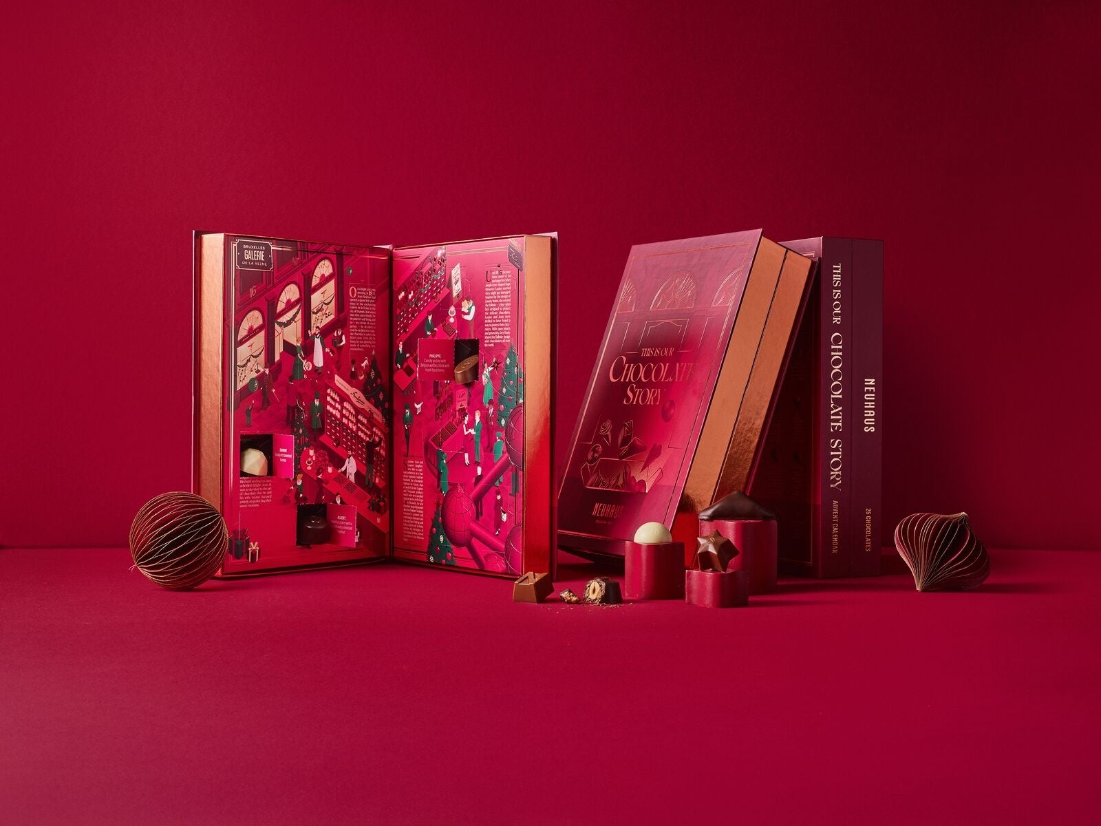 ギャラリー・デ・ラ・レーヌの薬局から「カプリス」誕生の瞬間まで、ノイハウスの物語を、4つのシーンで描いたブック型アドベントカレンダーです。重厚感のある装丁と美しいイラストが、開くたびに心をときめかせます。チョコレートとともに、歴史を辿りながらクリスマスを待ち望む特別な一冊です。