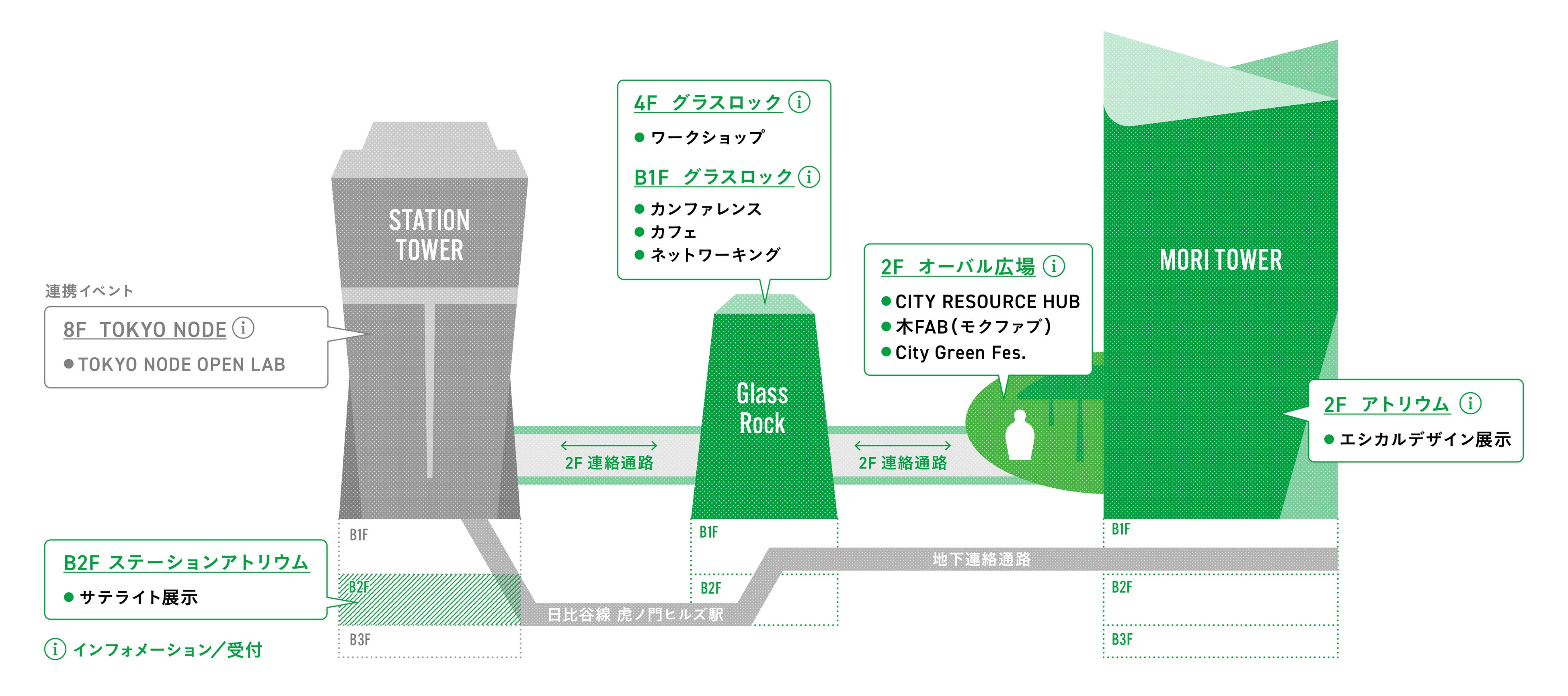 場は当イベントの趣旨に賛同し協賛する、森ビル株式会社が管理運営する虎ノ門ヒルズ内各所で開催。虎ノ門ヒルズ 森タワー2階 アトリウムやオーバル広場のほか、2025年4月に開業したクロスセクターで社会課題解決を目指す拠点 「Glass Rock ~Social Action Community~」での開催を予定しています。