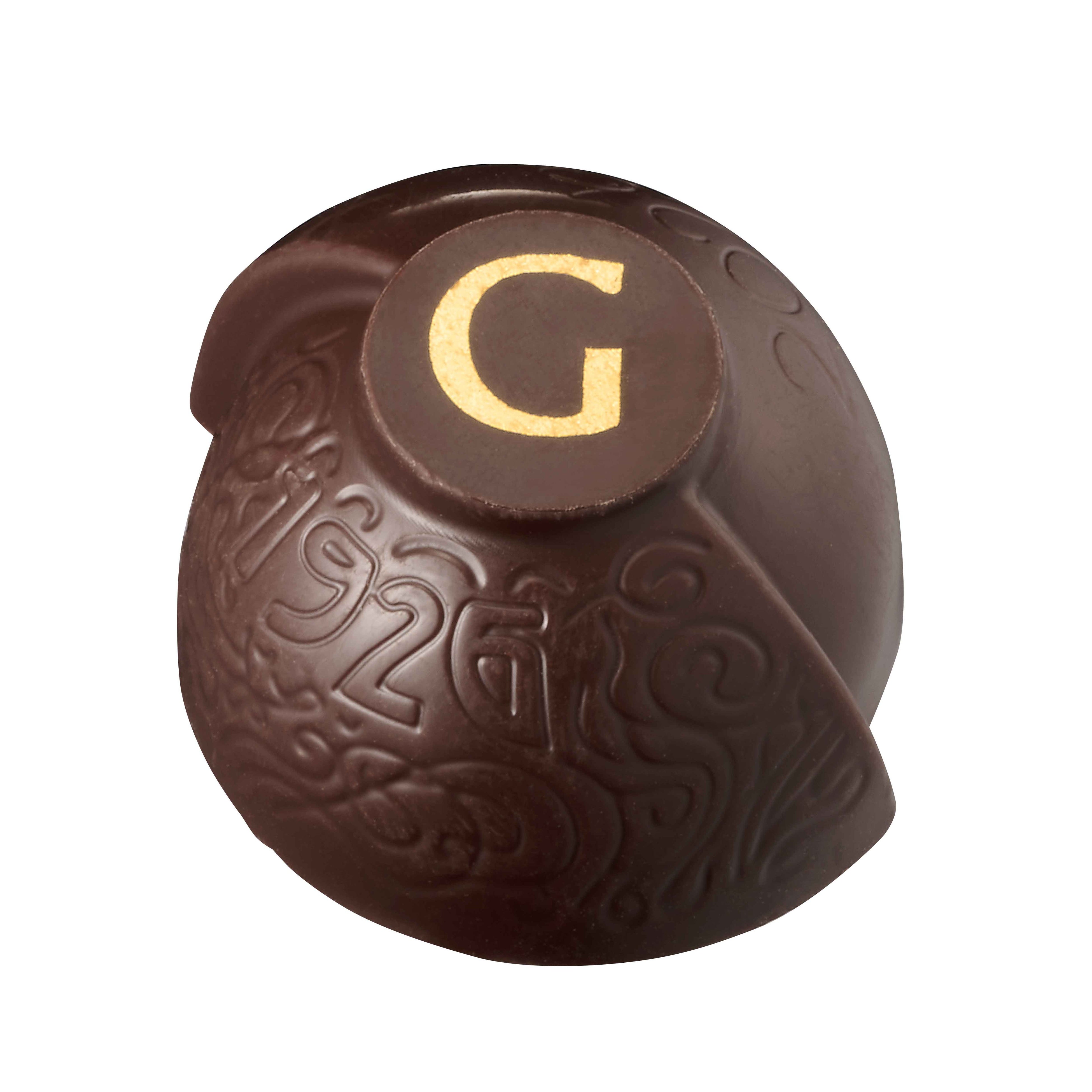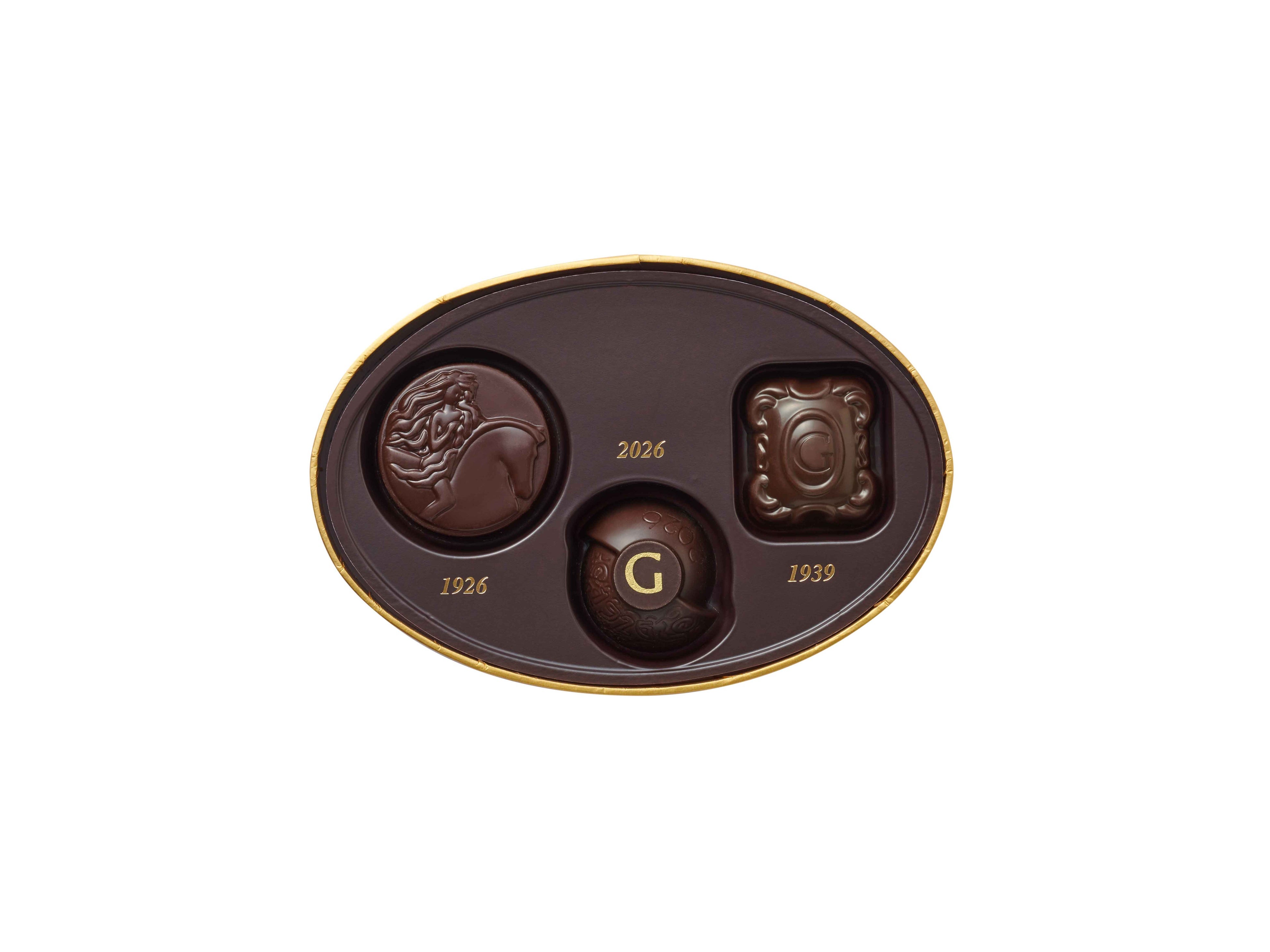 2026年、ゴディバ100年の歴史を祝い、創始者ピエール・ドラップスに敬意を表すアニバーサリーチョコレートが生まれました。ゴディバの過去100年とこれからの未来を表すロゴをあしらったカカオ分50%ダークチョコレートのシェルで、カカオフルーツジュースとダークチョコレートを使ったガナッシュを包みました。