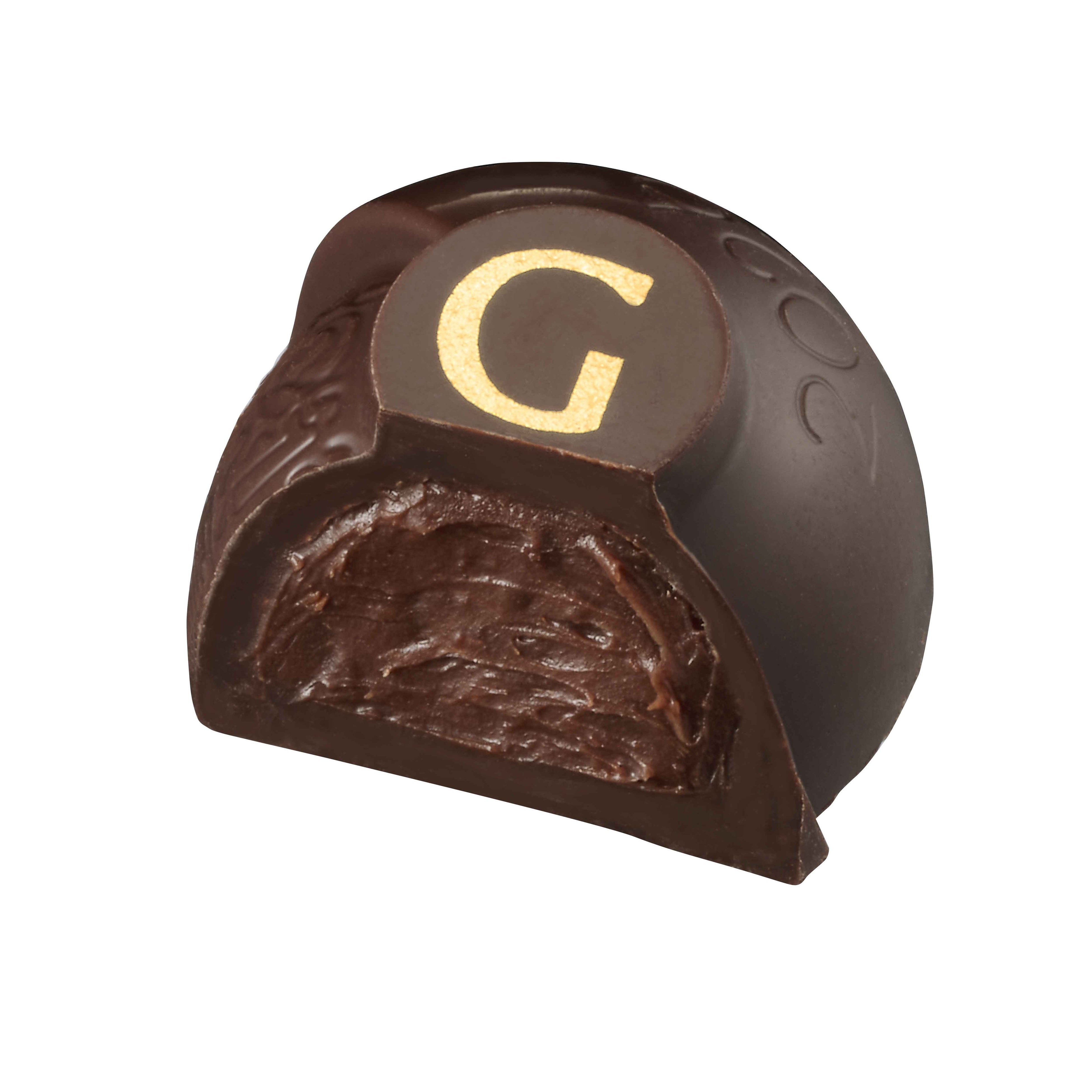 1972年、ゴディバの日本初上陸を記念して作られたひと粒。伝統的なヘーゼルナッツプラリネにライスパフを入れ、ダークチョコレートで包みました。飾りつけはミルクチョコレートとゴールドのグリッターでエレガントに仕上げました。