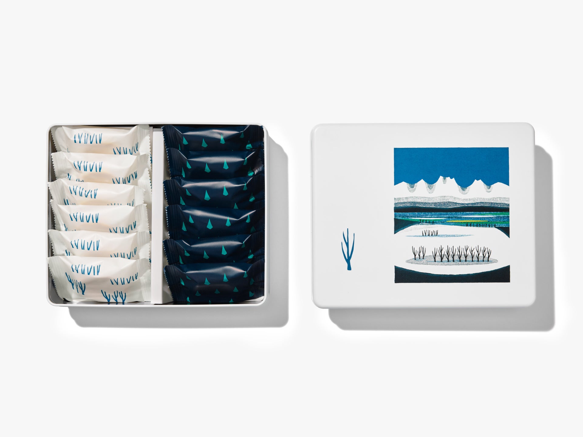 濃厚でコクのある冬の放牧牛乳を使って仕上げた生チョコレートは、ミルクの風味が感じられるリッチな味わいが特徴です。さらに、SNOWSの世界観を作りあげる“⼭の版画家”⼤⾕⼀良さんの作品「春を待つ日」がデザインされたオンライン限定デザインパッケージが登場します。