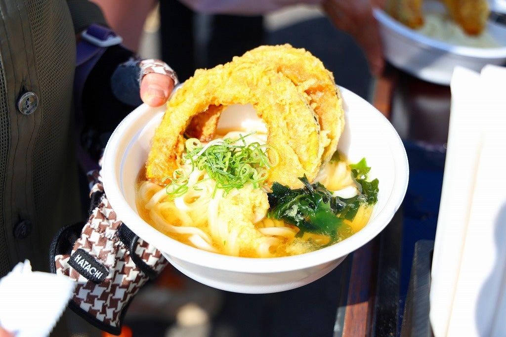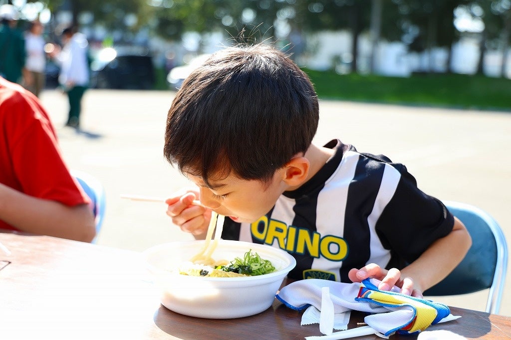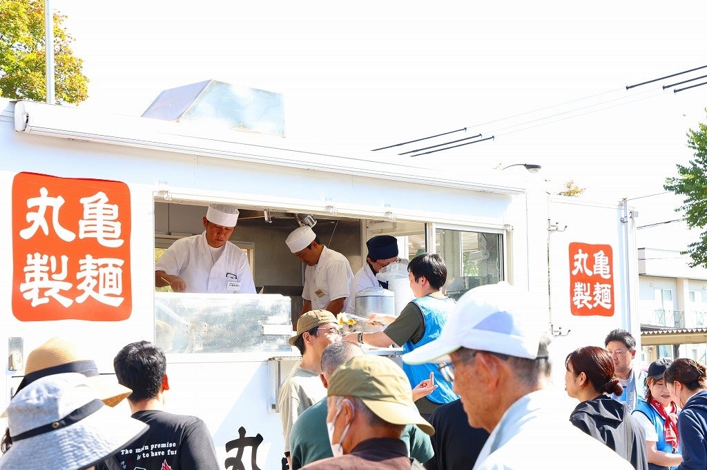 美瑛町の皆さまとボランティア参加者に向けて、丸亀製麺キッチンカーでのうどんとかぼちゃ天を無償提供しました。