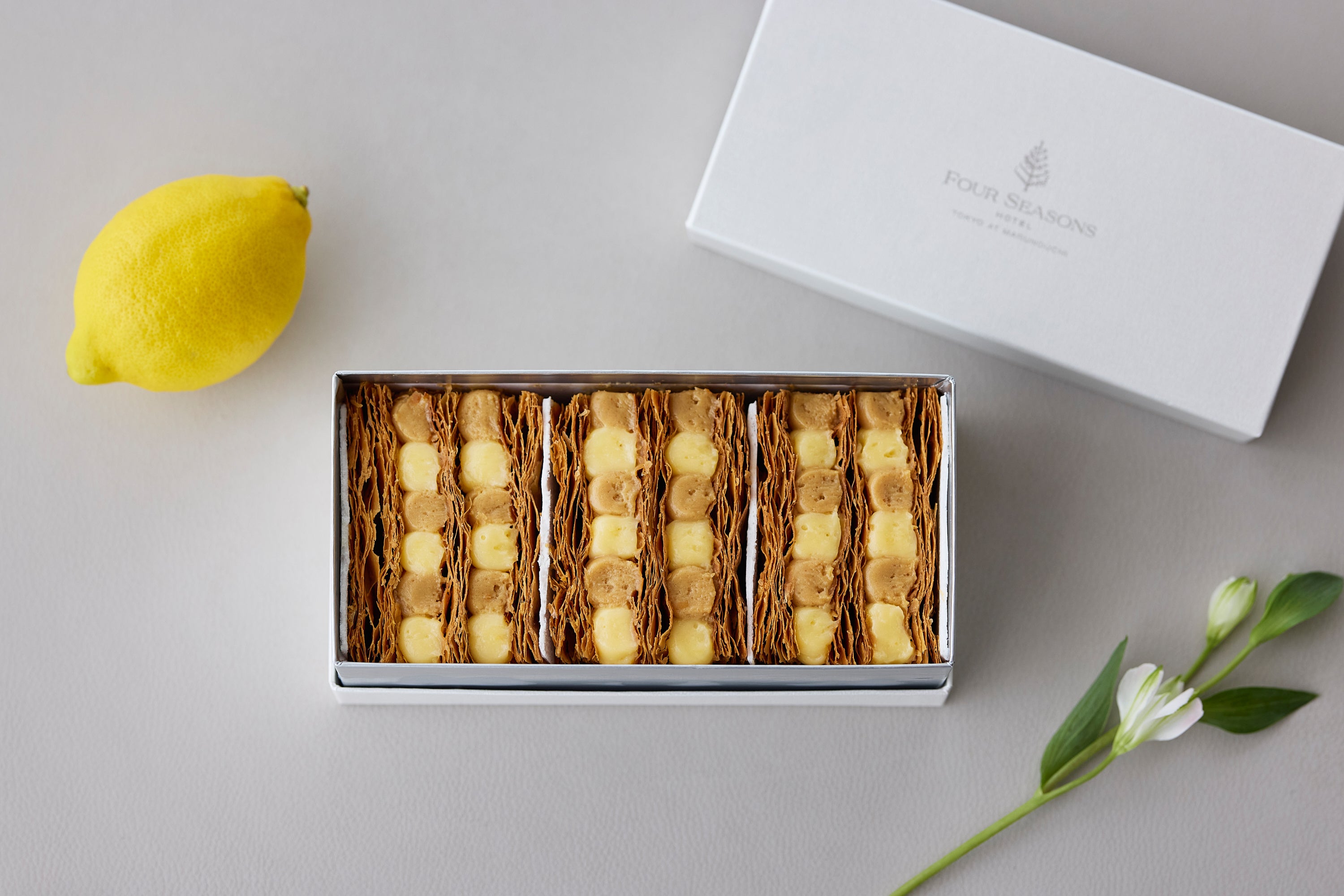 シグネチャーミルフィーユの冬の味は、爽やかなレモンカードと香ばしいアーモンドプラリネクリームを重ねた「レモンとプラリネのミルフィーユ」。