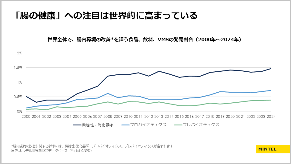 ミーガンは、はじめにミンテル世界新商品データベース(Mintel GNPD)による分析から世界全体で、腸内環境の改善*を謳う食品、飲料、VMSの発売割合(2000年~2024年)を提示し、「機能性-消化器系」、「プロバイオティクス」、「プレバイオティクス」を訴求する新商品が世界的に増加傾向にあることを示しました。