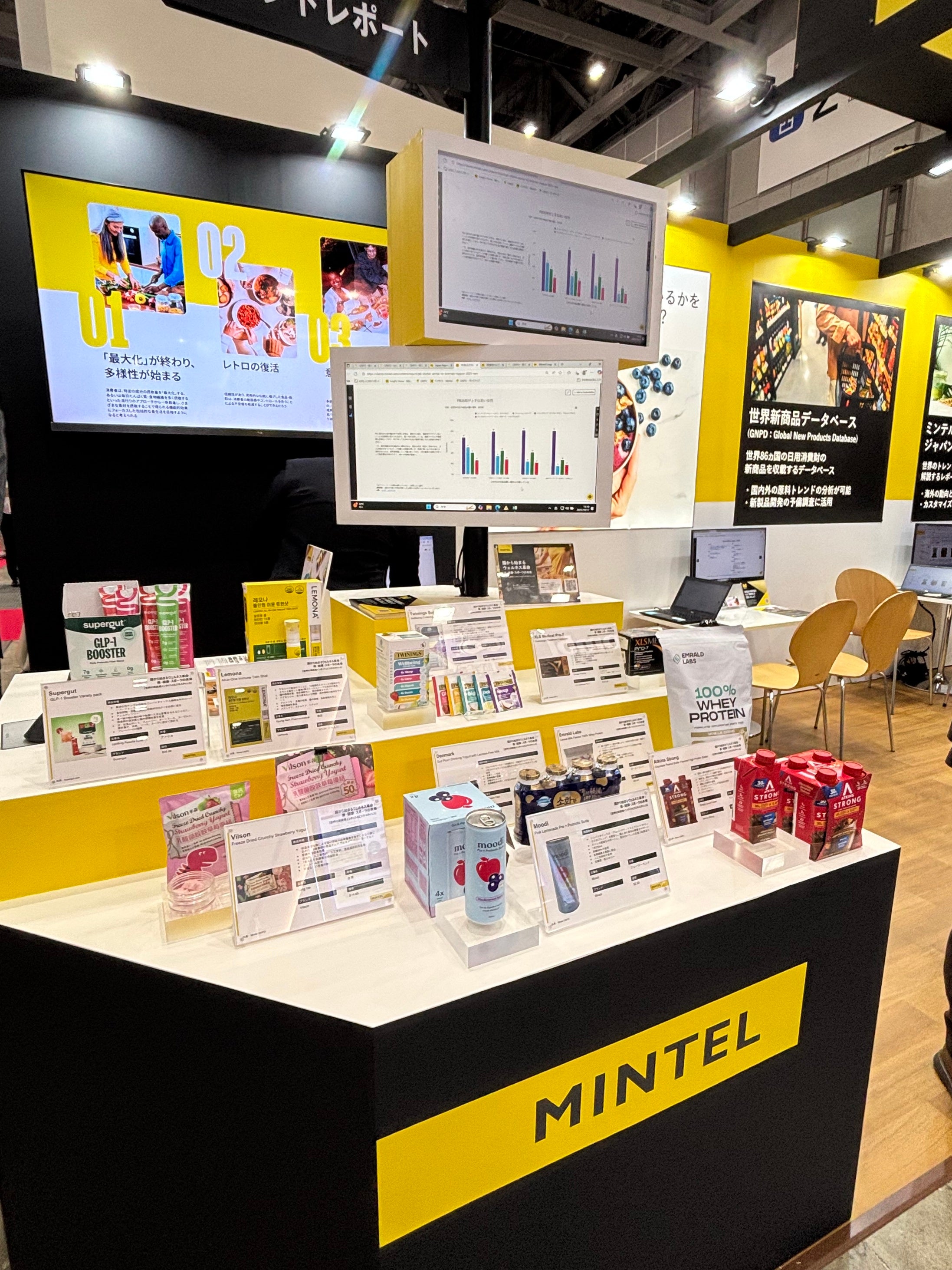 ブースでは、講演者のミーガンが本展示会のためにピックアップした「世界の腸活製品」を展示しました。展示品にご興味のある方は、ぜひミンテルジャパンまでお問い合わせください。