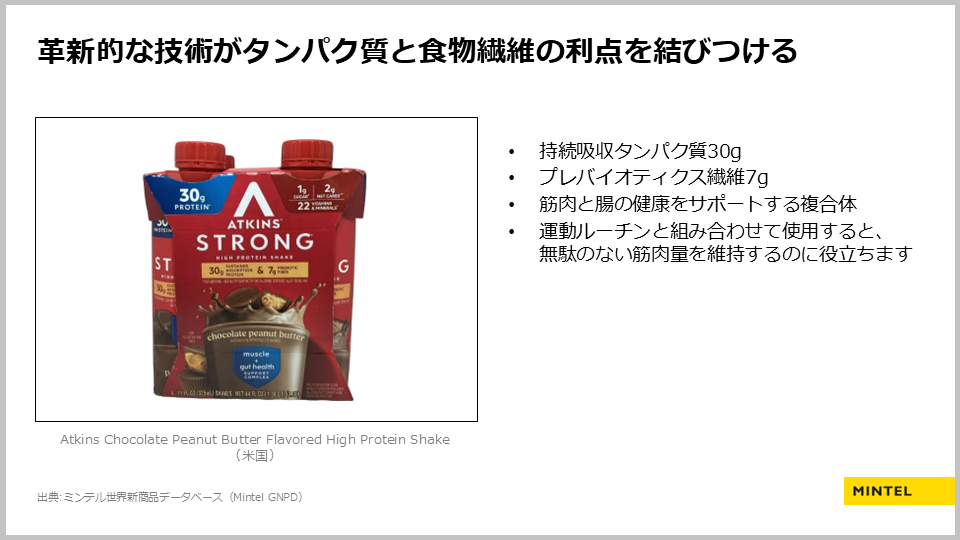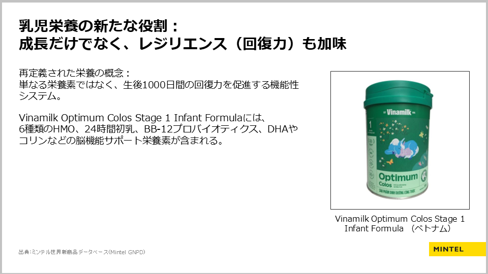ミンテルが今月発表した『2026年:グローバル食品・飲料トレンド予測』では、現代に特有の日々変化する環境に対して、消費者がより耐性を高め、レジリエンス(回復力)を持てるように食品・飲料ブランドがどう貢献できるかを示しています。本講演の中でも、新生児用のミルクを一つの例として紹介しました。