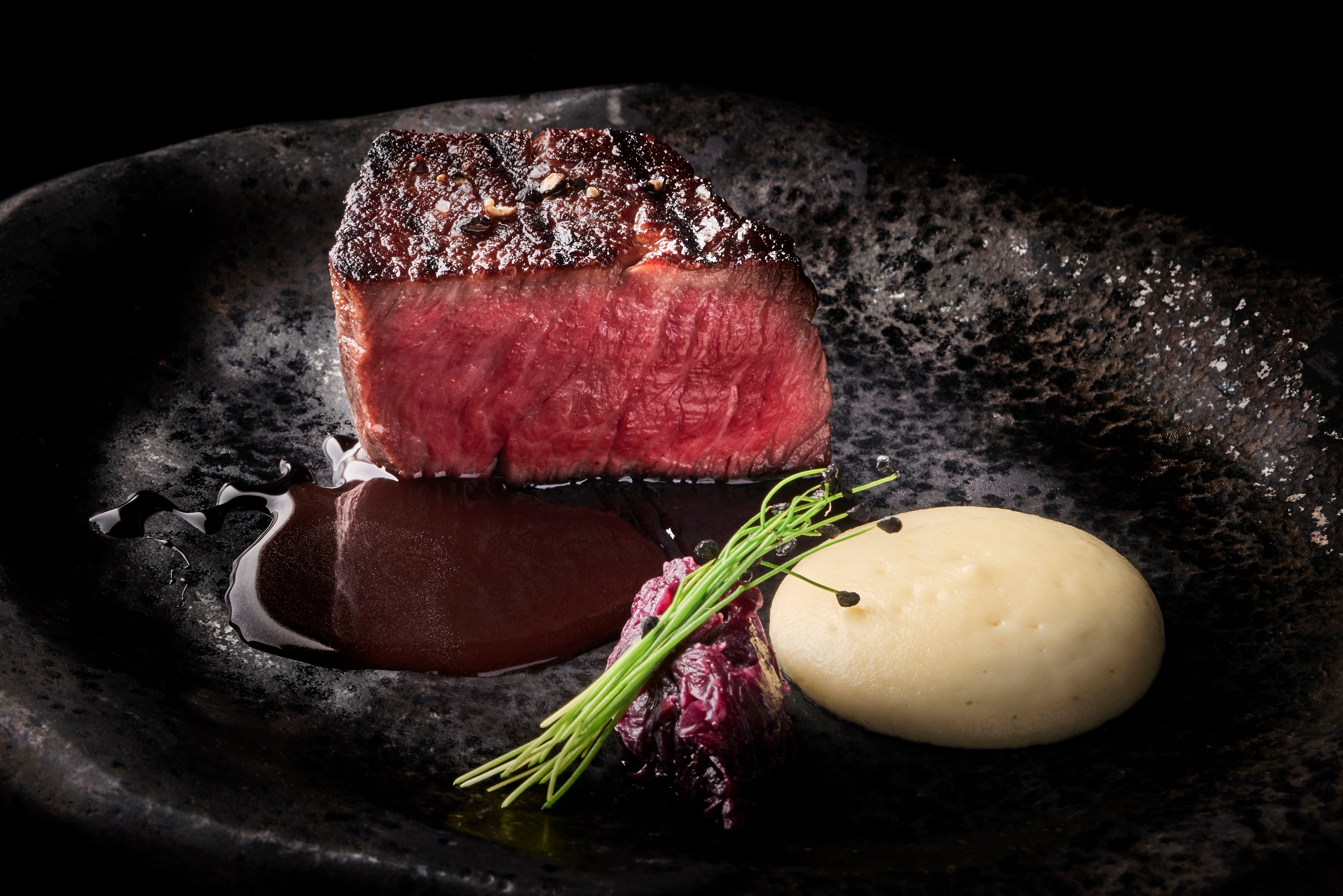 赤身の旨み、脂の甘みが優れた熊本県原田畜産の延寿牛 を、奈良県の熟成師による100日以上の熟成をかけることで、ナッツやチーズを思わせる熟成香をお楽しみいただけます。1°C単位の火入れにこだわり抜き、低温でじっくりと火入れをすることで、熟成牛のポテンシャルを最大限に引き出したメイン料理です。