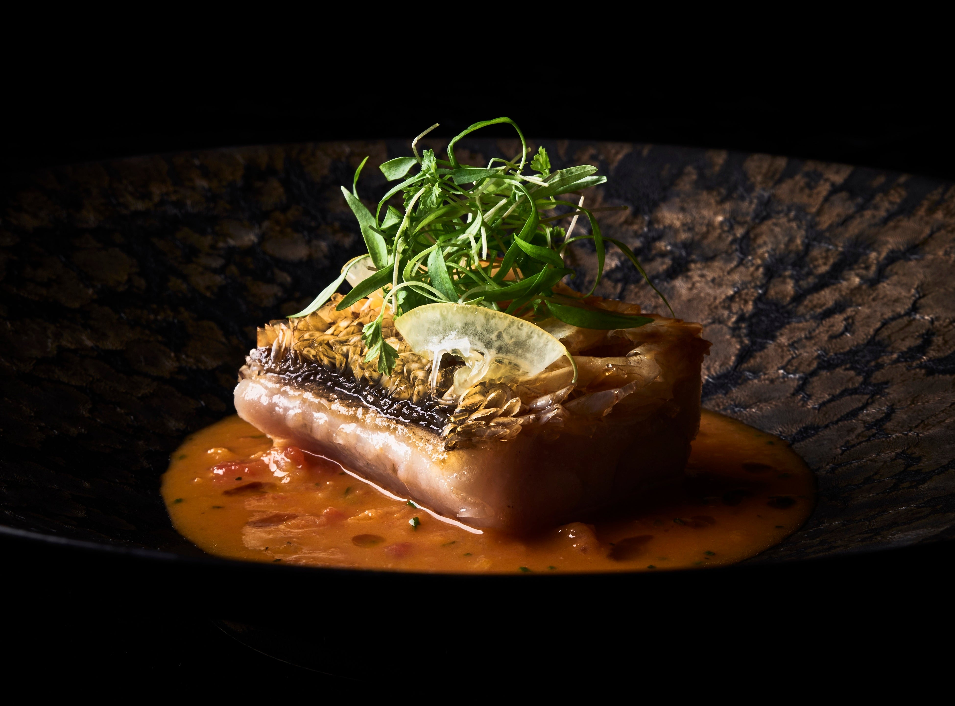 その時期に水揚げされた物の中から最良の甘鯛を厳選し、鱗は残したまま高温で火入れをすることでクリスピーな食感とふっくらとした身の食感のコントラストをお楽しみいただける小林圭シェフを代表するお料理の鱗焼きを、蛤やフュメドポワソンなど魚介の旨みを存分に感じられる一品に仕上げました。
