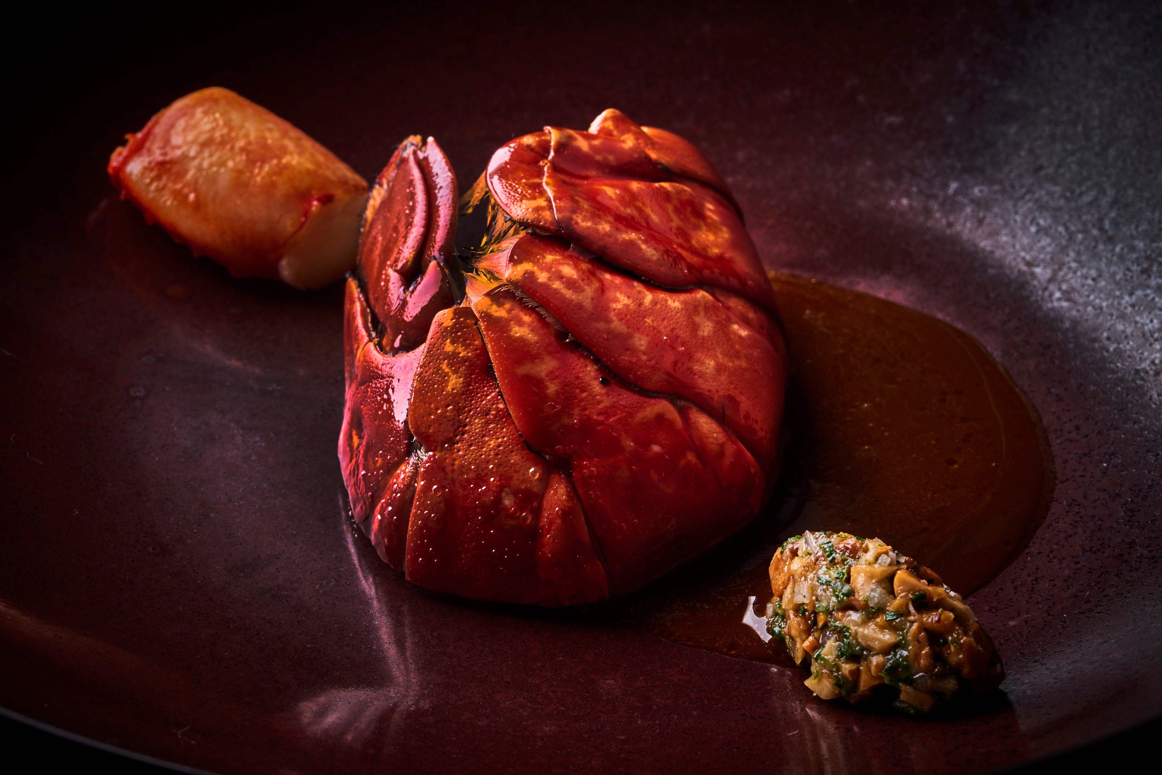 フランス ノルマンディ産のオマールブルーを低温で火入れし、藁の瞬間燻製にて仕上げ、⻭応えと海老の甘みをお楽しみいただけます。ソースには旨みが凝縮されたオマールディーヌに甜麺醤や豆板醤でスパイシーなニュアンスを加えました。お好みでナッツと柑橘の香りのコンディメン トを合わせてお召し上がりください。