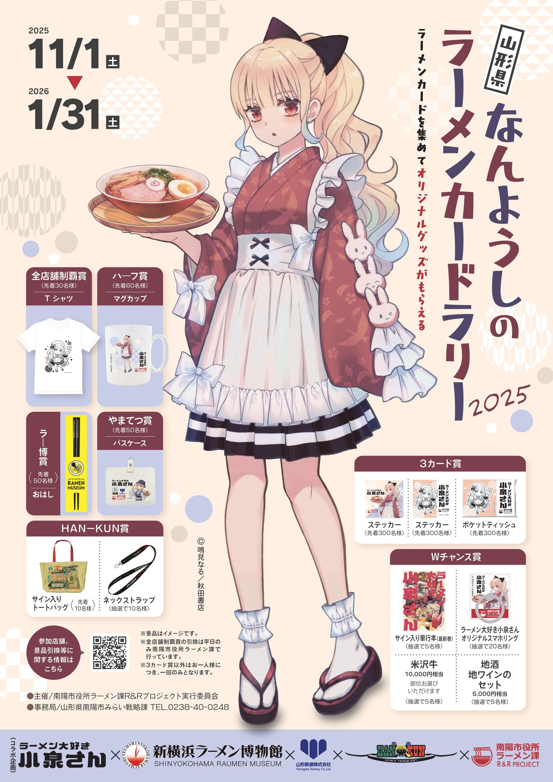 「なんようしのラーメンカードラリー」は、南陽市内のカードラリー参加店舗でラーメンを食べると、もらえるカードを集めるカードラリー。カードや景品には、人気漫画『ラーメン大好き小泉さん』が描かれるほか、南陽市ラーメン大使である湘南乃風メンバーの「HAN-KUN」とコラボするなど、例年、市内外から大勢のラーメンファンらが参加する人気企画。