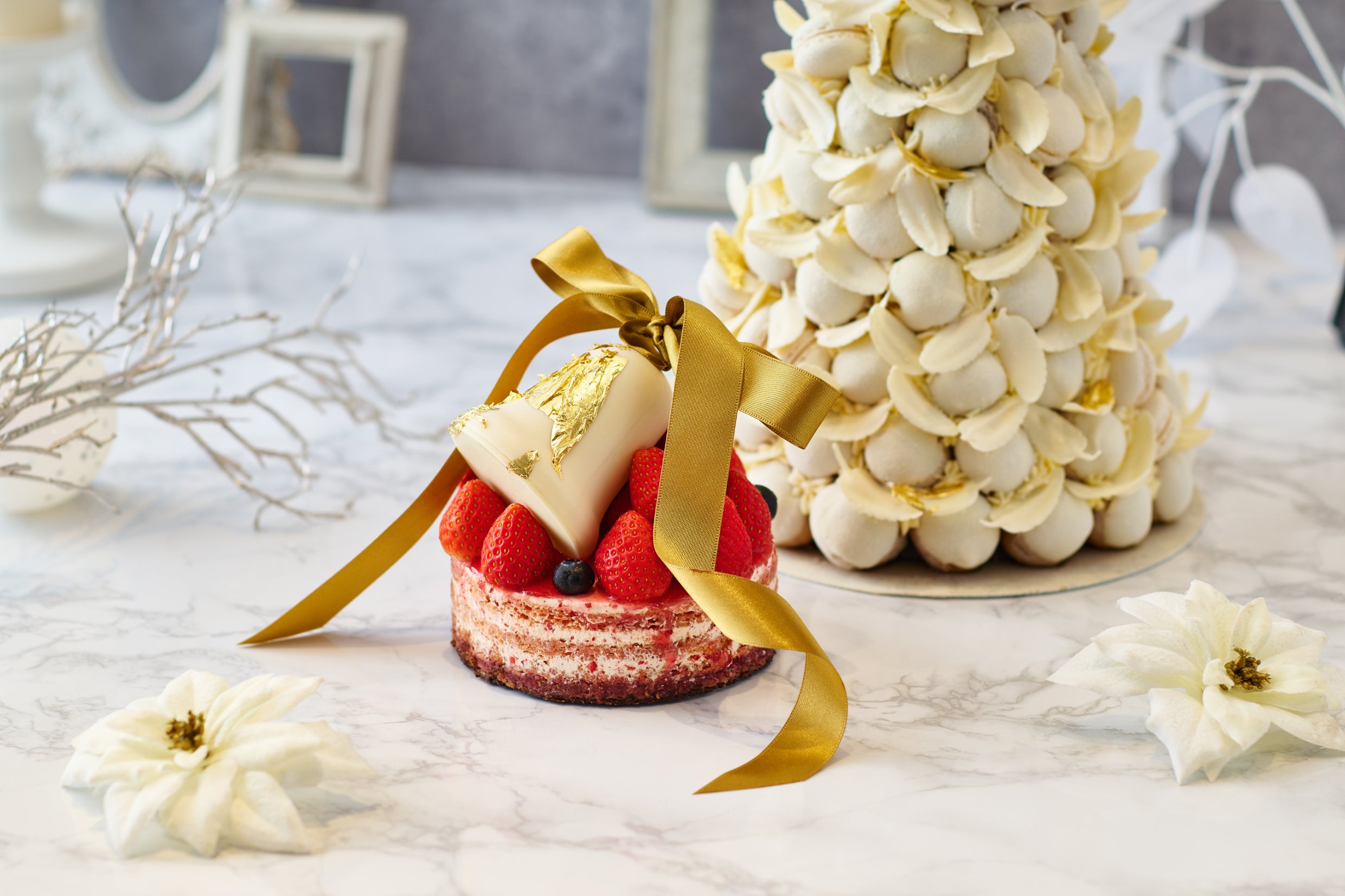 今年のクリスマスケーキは、雪が降り積もるクリスマスツリー(Tour)に白い天使(Blange*)が舞い降りたイメージを伝統的なスイーツ「クロカンブッシュ」で表現しました。4種類のフレーバー(バニラ、レモン、コーヒー、ピスタチオ)で仕上げたプチシュークリームとバニラバタークリームのマカロンを、クリスマスツリーの形に積み上げました。またツリーの中には、苺バタークリームやラズベリージャムで仕上げたあまおう苺のオペラが入っており、ホワイトチョコで作ったベルのオーナメントを飾りました。ご家族やご友人と過ごすクリスマスにぴったりの特別な一品です。この特別なクリスマスケーキで、華やかなひとときをぜひお楽しみください。