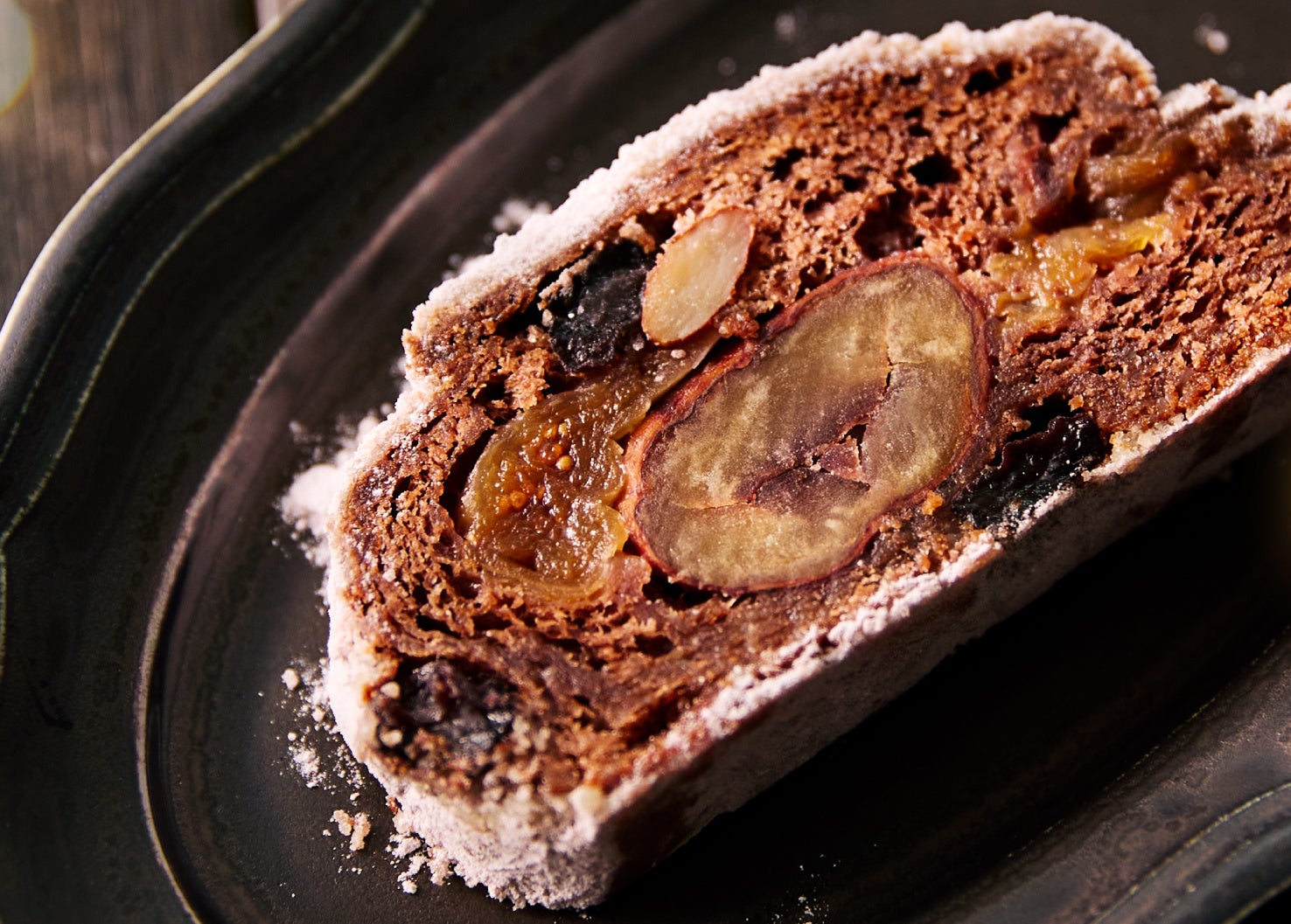 ショコラ生地に大粒の和栗をごろっと入れ、白ワインに漬け込んだイチジクやラム酒漬けレーズン、香ばしいアーモンドとマカダミアナッツなどを合わせて焼き上げた贅沢な味わいのプレミアムシュトーレン。ほのかにスパイスの香る、芳醇で風味豊かな自慢の美味しさです。数量限定でご用意しております。