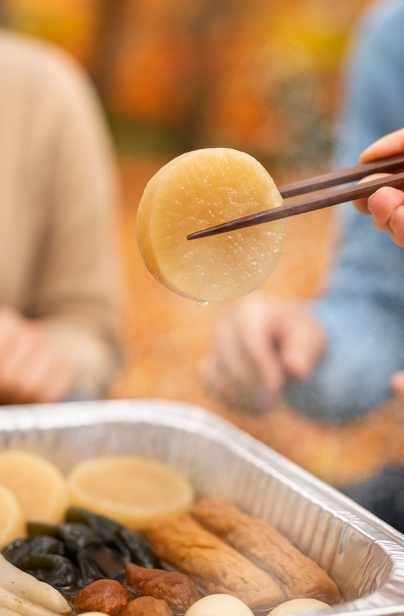 ・アツアツ!火も電気も使わない「温かいおでん」:独自の「温め機能付き容器」により、火気や電気を使わずに温かいまま提供可能。自然の中でも安心して楽しめます。