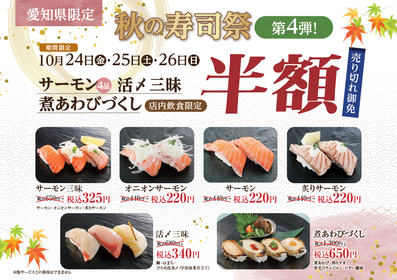 株式会社フーズネット(本社・⼤阪府⼤阪市、代表取締役社⻑・加藤誠)が運営する「活⿂廻転寿司にぎり⻑次郎」は、2025年10月24日(金)から2025年10月26日(日)までの3日間、秋の寿司祭【第4弾】を愛知県内の店舗限定で開催いたします。にぎり長次郎の人気の「サーモン」4品とその他2品のお寿司を、期間限定で半額で販売いたします。ぜひイベント期間中は、にぎり長次郎へお越しください。
