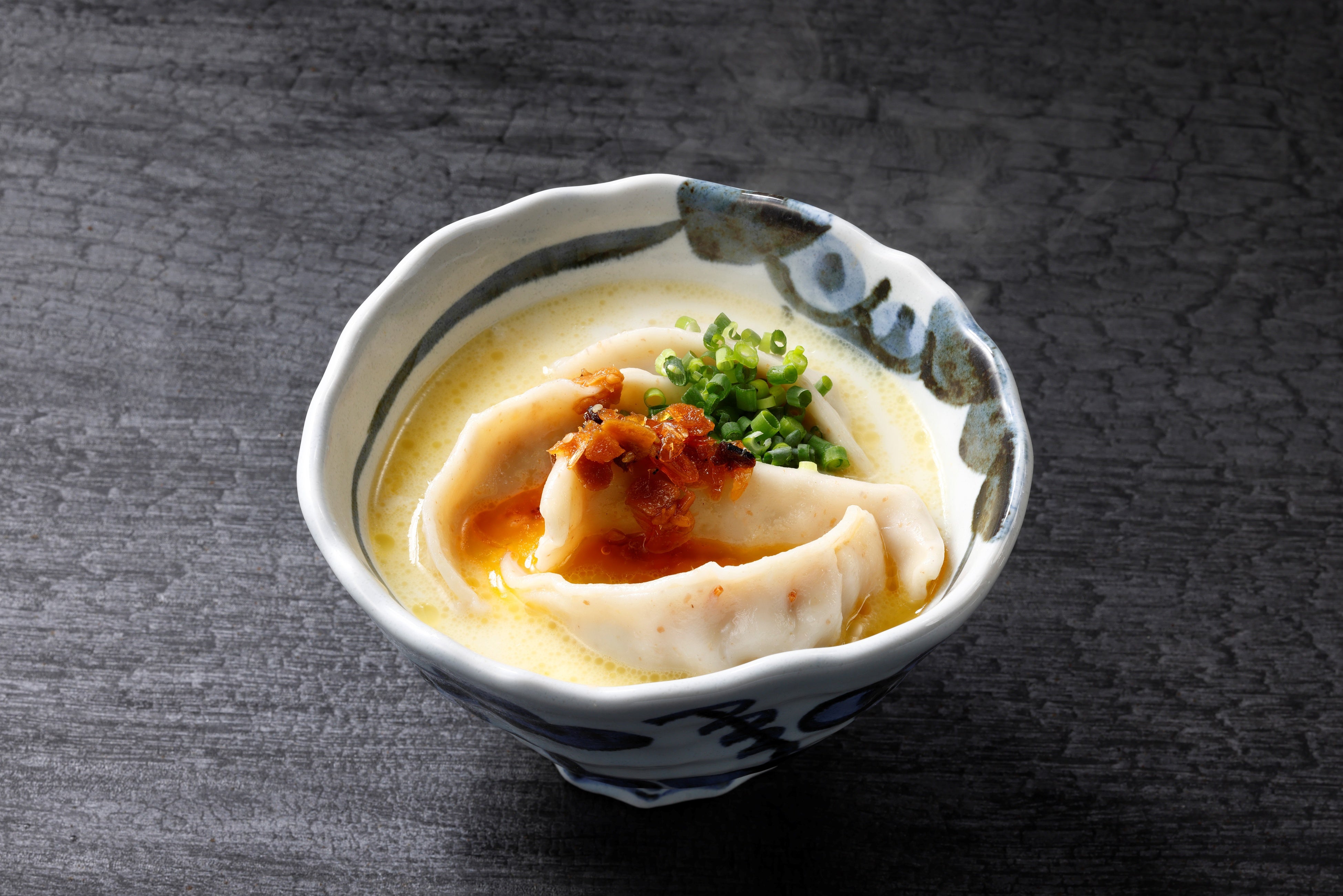 「豆乳白湯(パイタン)肉汁餃子」は、真っ白な豆乳白湯スープ餃子です。