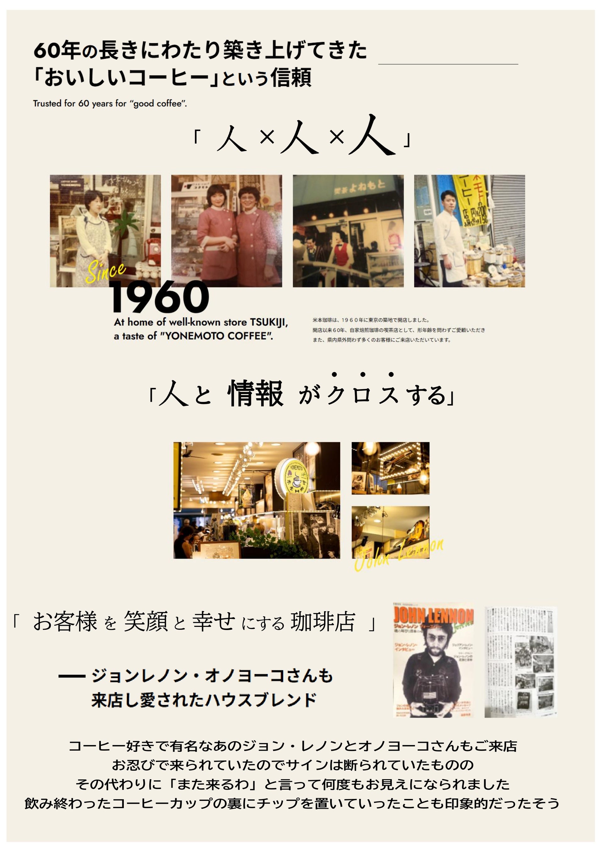 長年市場に精通し、プロの買い出しのお客様同士を結び、情報の交差点の役割をコーヒーを通じて提供してまいりました。近年の築地はインバウンド対応にも力をいれ世界中の人から愛される珈琲店として認知されています。