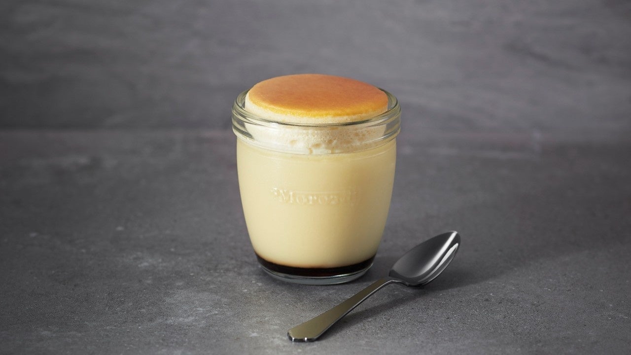 カスタードプリンと、ふわっととろけるなめらかなチーズケーキを組み合わせたモロゾフのガラスカップ入りスイーツ。