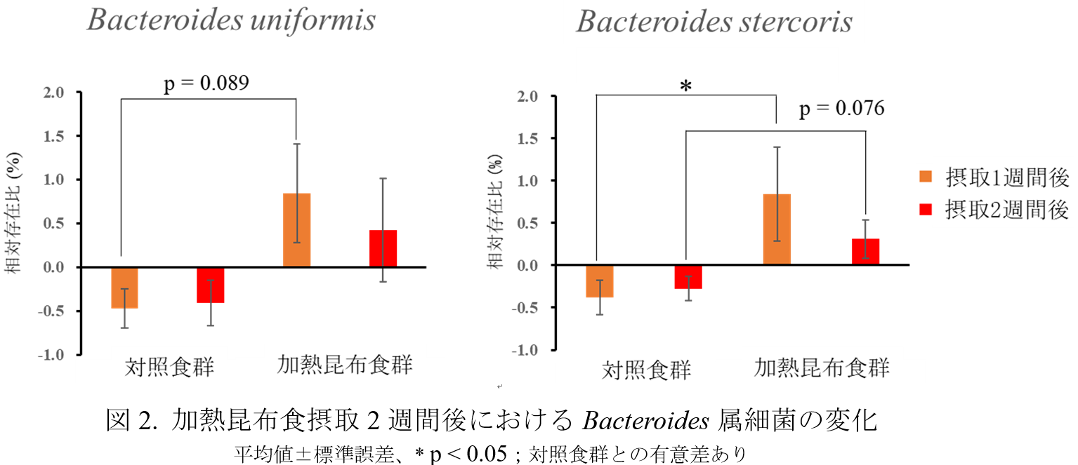 さらに、昆布の食物繊維の一つであるアルギン酸を分解することが報告されているBacteroides 属細菌の変化量も有意に増加しました(図2)。