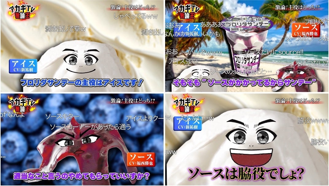 動画内では、アイスとソースが「フロリダサンデーの主役は自分だ!」と主張し合い、白熱した議論を展開。アイス役には声優の新祐樹さん、ソース役には福西勝也さんを起用。あの手この手で論破しようとする“味の激突”が繰り広げられます。両者譲らない、アイスとソースの前代未聞の討論バトルにご注目ください!