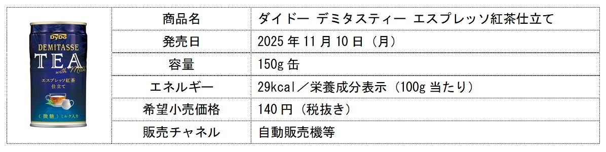 ダイドードリンコ株式会社(本社:大阪市北区、代表取締役社長:中島 孝徳)は、2025年秋冬の新商品として、ロングセラーシリーズ「デミタス」の新たなラインアップ「ダイドー デミタスティー エスプレッソ紅茶仕立て」を、11月10日(月)より発売いたします。
