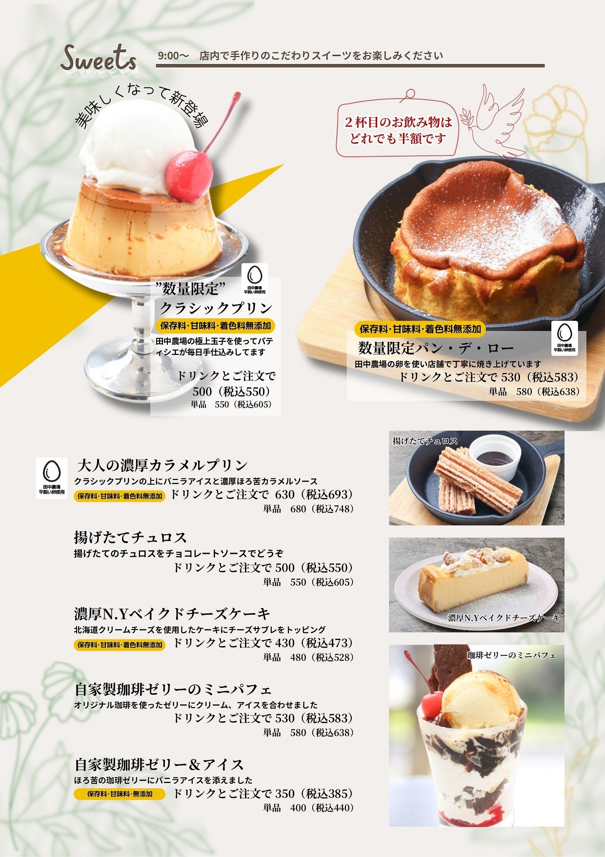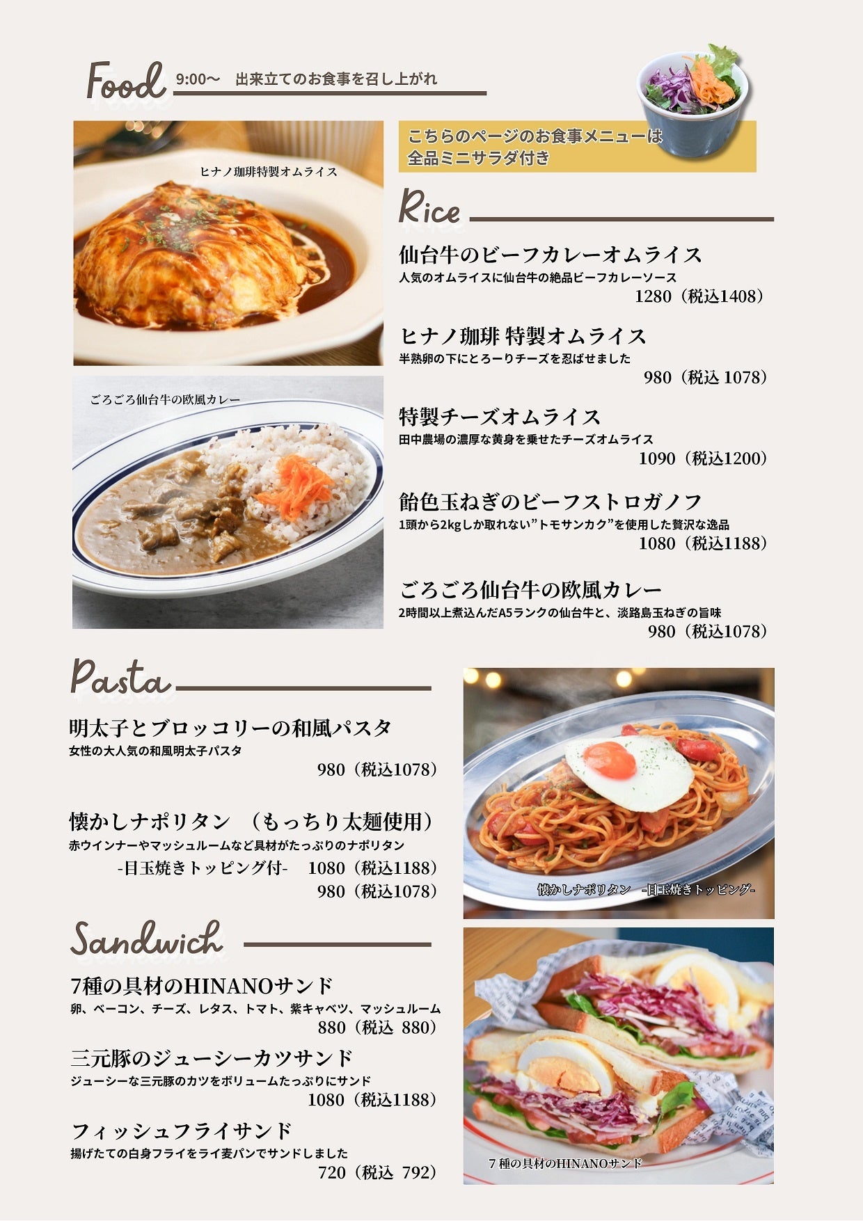 ヒナノ珈琲の自慢は、素材にこだわった淹れたての珈琲と、ミシュラン星付き店も使用する〈田中農場の極上卵〉を贅沢に使用した自家製のクラシックプリンをはじめとしたスイーツ、そして特製オムライスなどの本格フードメニュー。味わい深い3種類のオリジナルブレンド珈琲は、それぞれが料理やスイーツに絶妙にマッチするように設計されています。