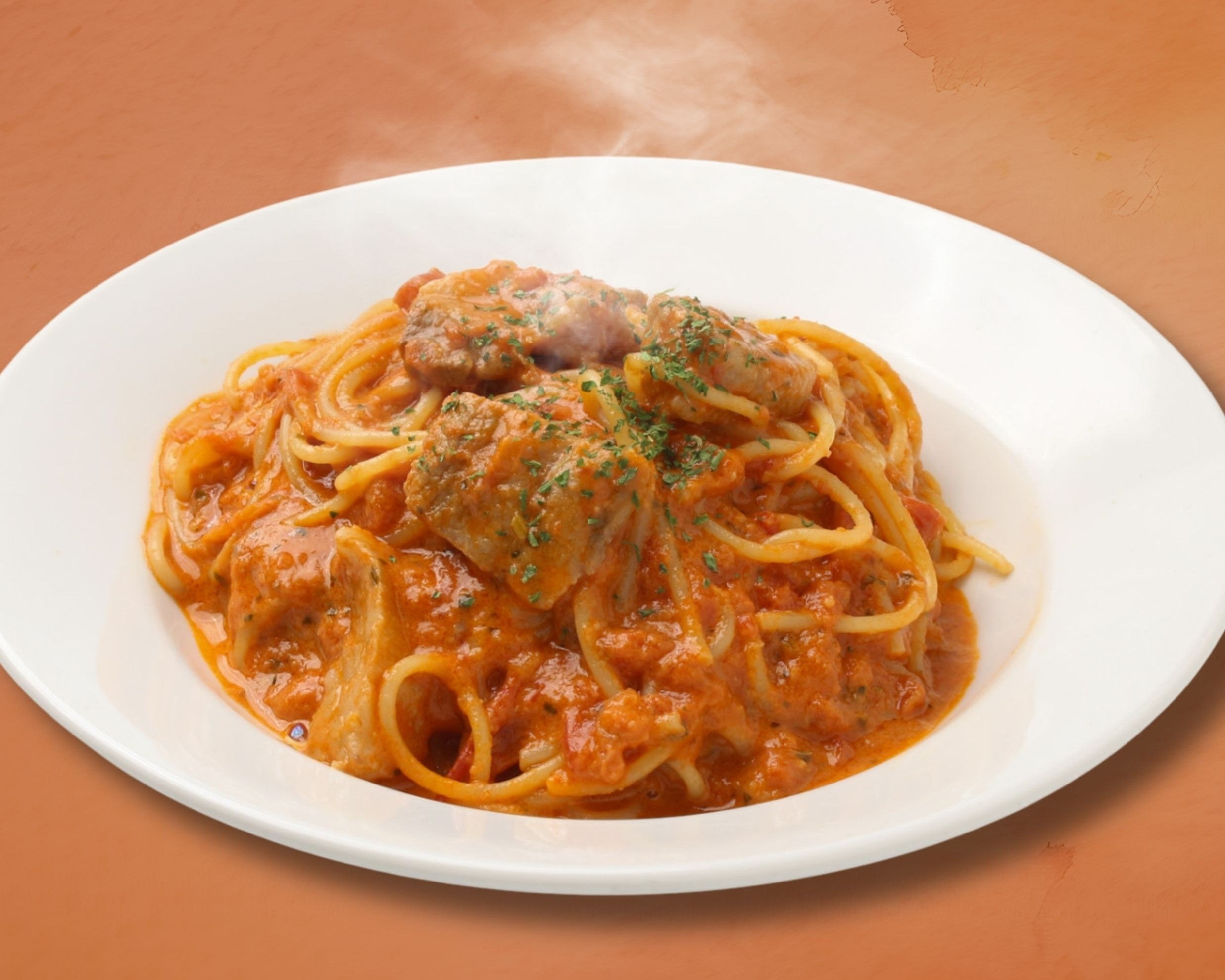 株式会社サイボクのブランド豚「ゴールデンポーク」の旨味を最大限に引き出した、ガーリックトマトソースに濃厚なクリームを合わせたトマトクリームソース仕立てのパスタです。