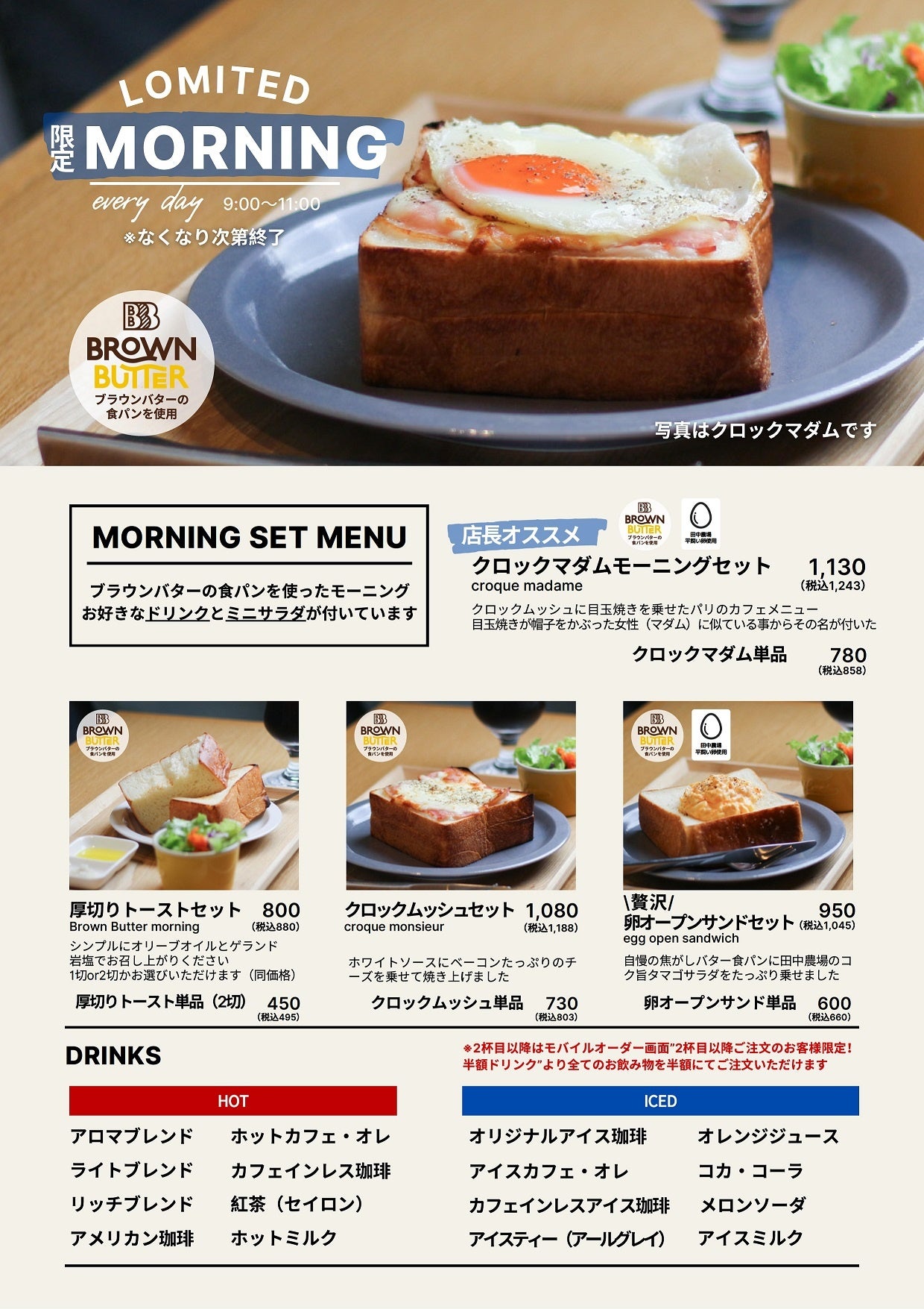 また、モーニングタイムには、隣接する焦がしバター食パン専門店「BROWNBUTTER」の食パンを使用した「クロックマダム」など、朝から贅沢な味わいを楽しめるメニューも人気を集めています。