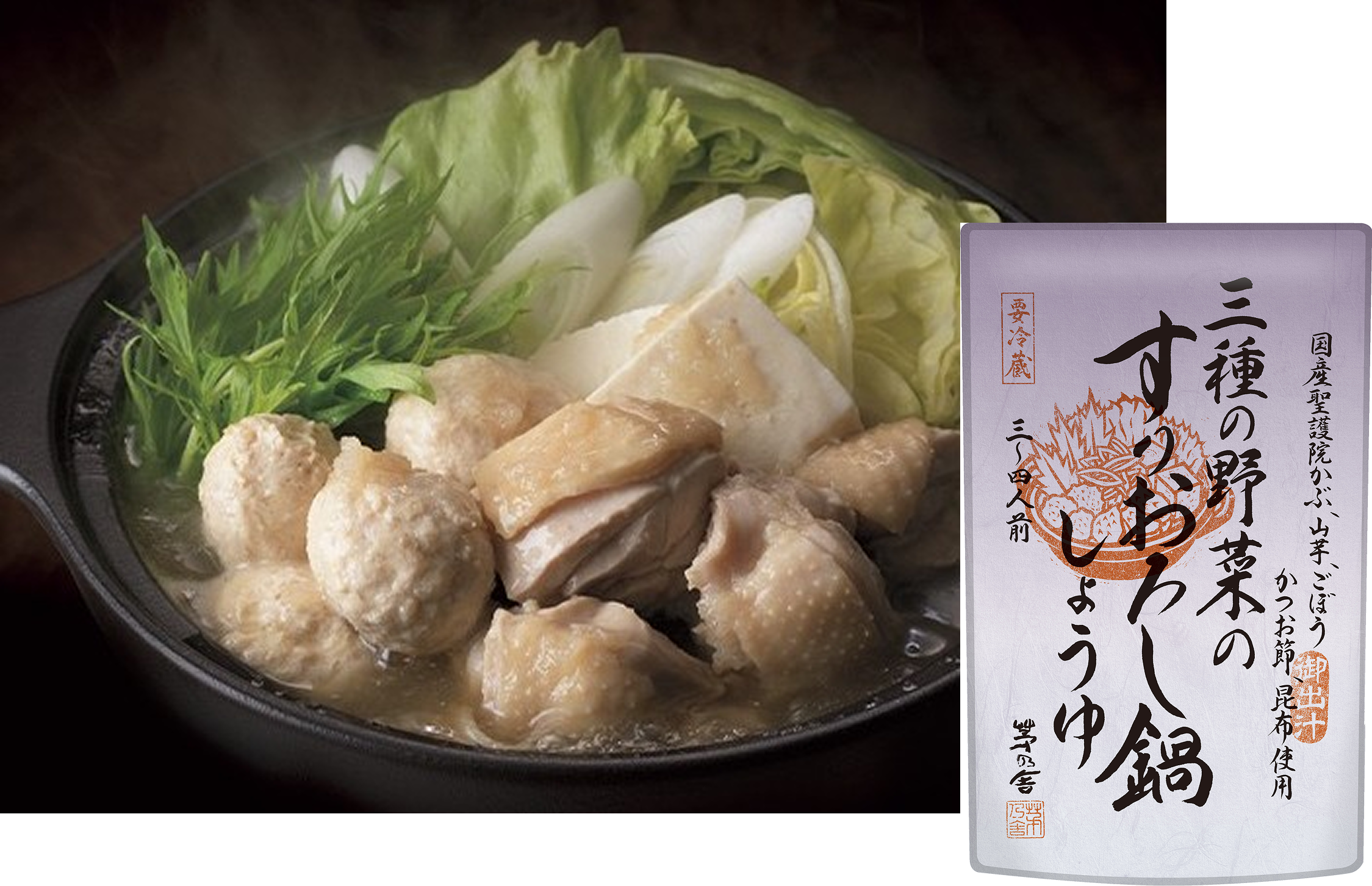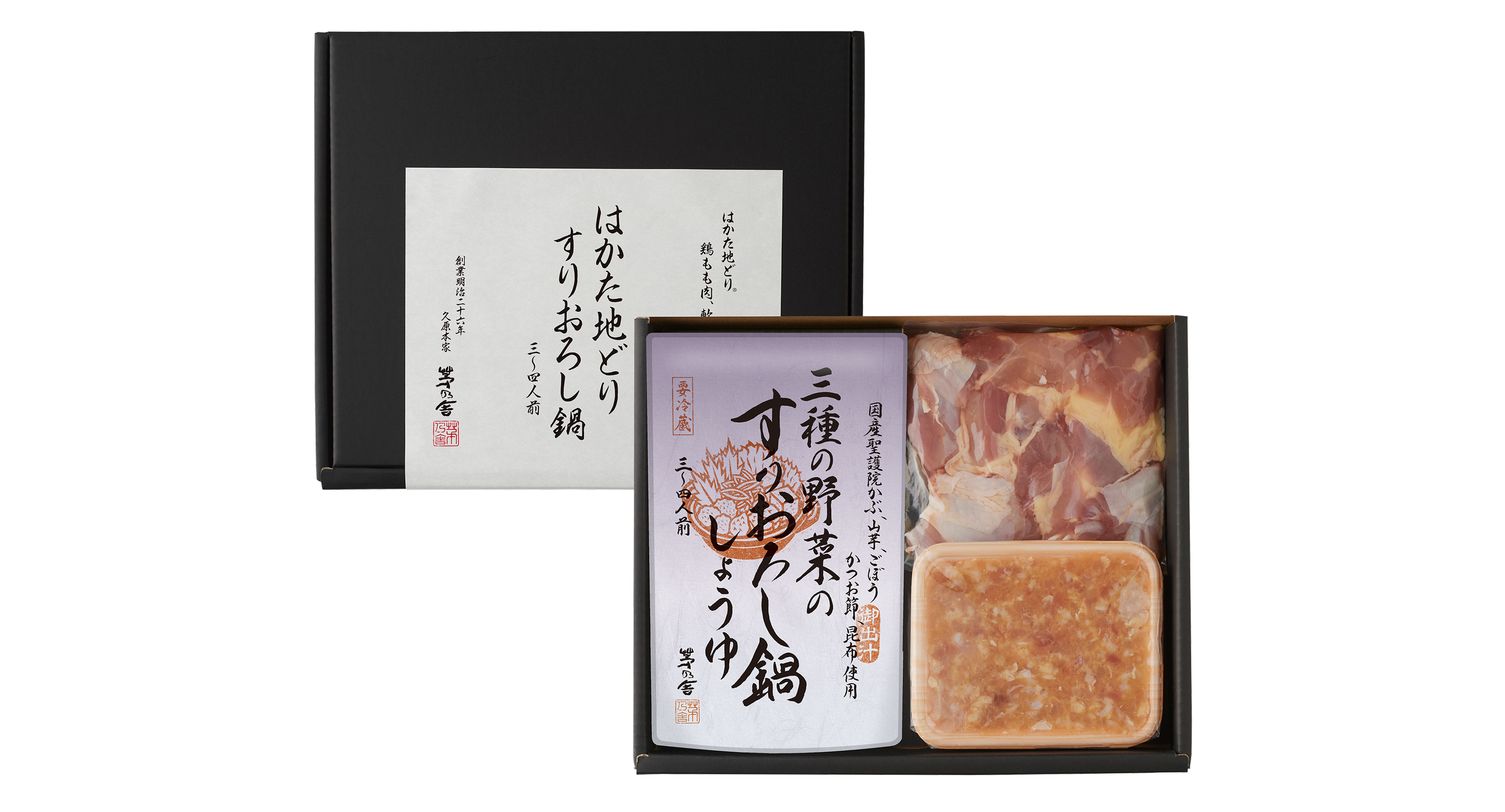 「三種の野菜のすりおろし鍋(しょうゆ)」に、厳選したはかた地どり®をセットでご用意しました。かぶや山芋などの野菜のとろみとお肉のうまみが体に沁みる、滋味深いおいしさです。ご家族やご友人との団らんの場にぜひご活用ください。