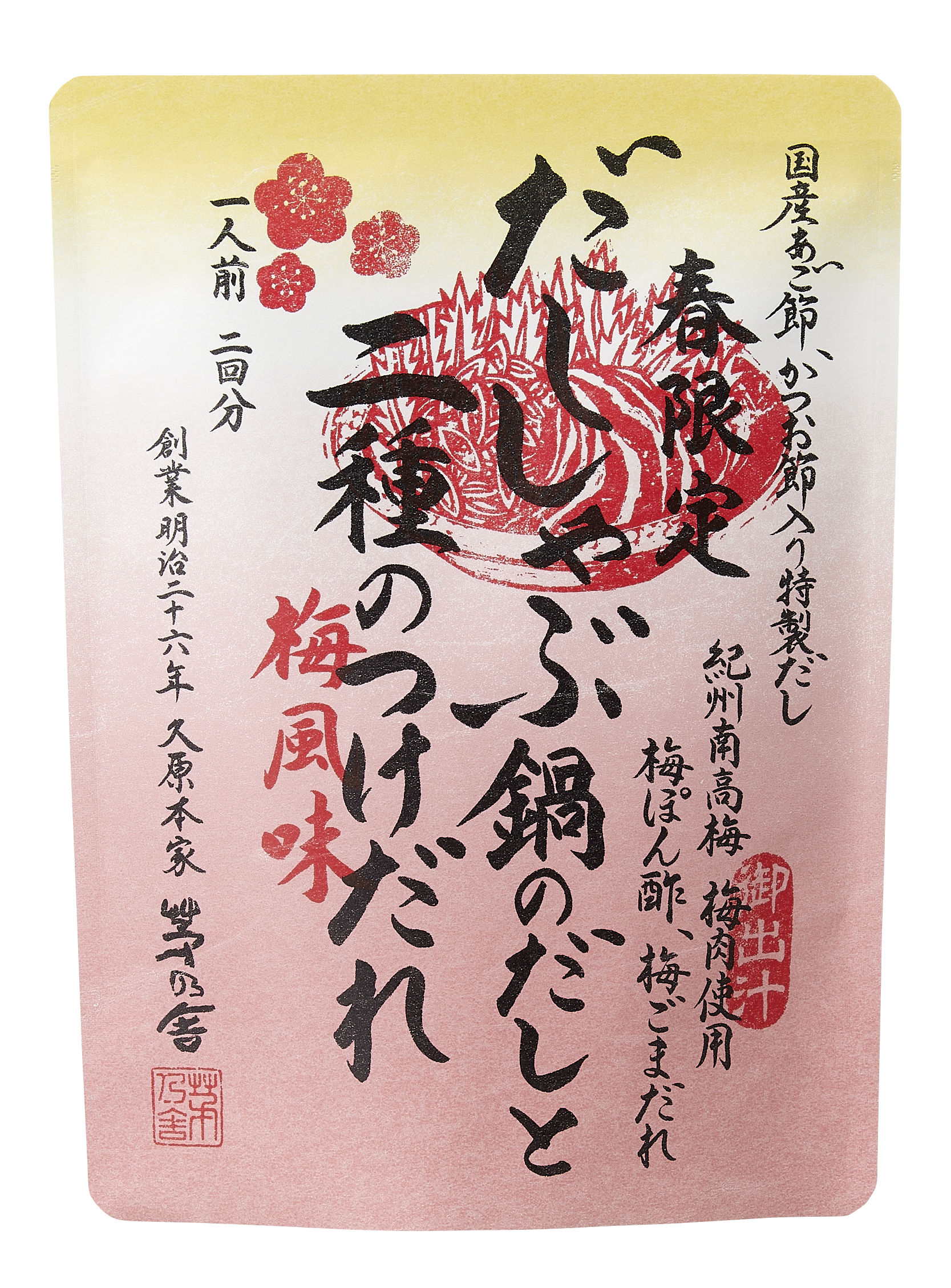 さっぱり「梅ぽん酢」と濃厚な「梅ごまだれ」、二種のつけだれで味わうだししゃぶ鍋。国産あご節、かつお節入りの「特製だし」に具材をくぐらせて、梅の香り爽やかな味比べをお楽しみください。
