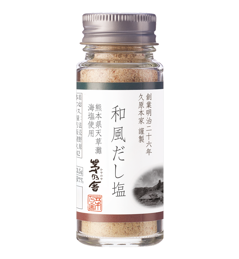 まろやかなうまみの海塩に、茅乃舎だしと同じ鰹節・うるめいわし・焼あご・真昆布を加えた、和風調味塩です。