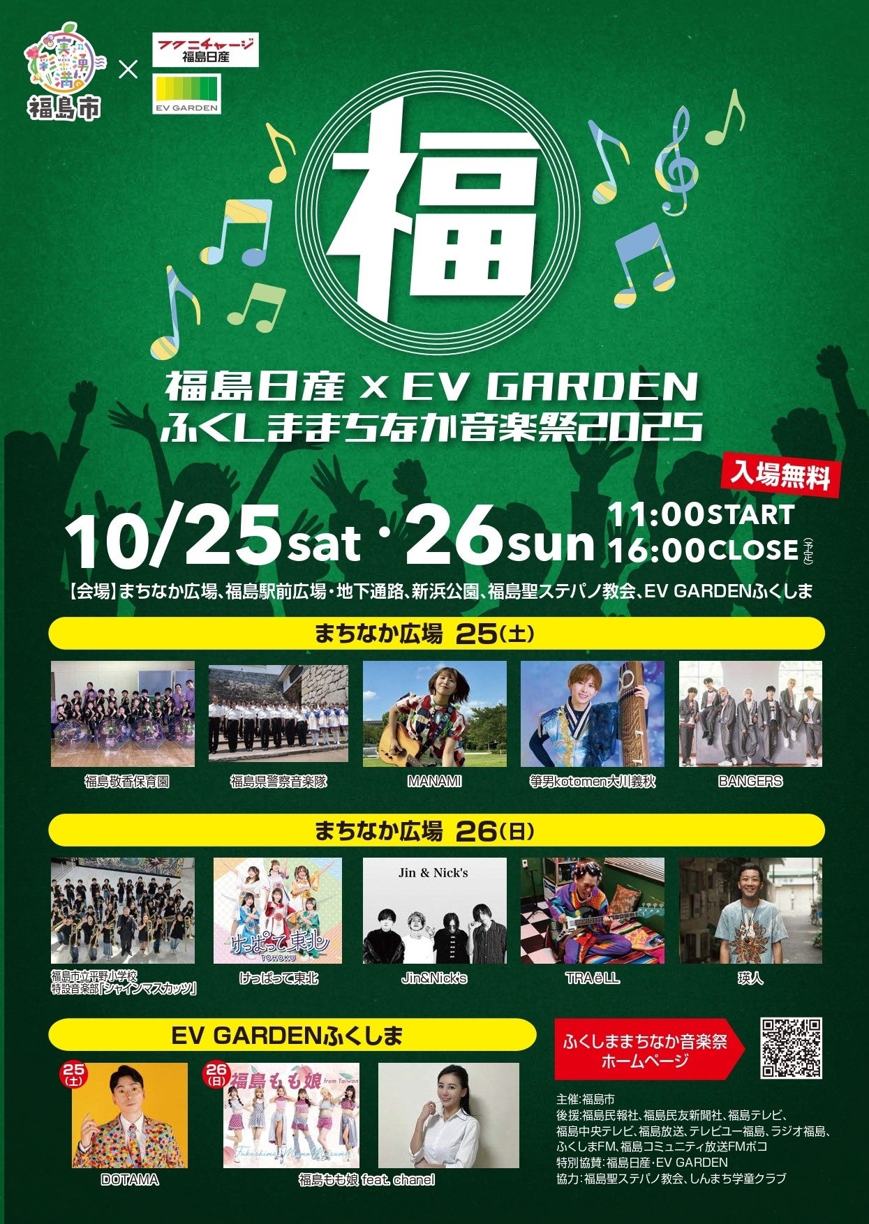 株式会社EV GARDEN(本社:福島県福島市、代表:金子 與志幸、以下、EV GARDEN)は、2025年11月1日(土)の『EV GARDEN ふくしま』グランドオープンを前に、10月25日(土)・26日(日)の2日間、プレオープンイベントを開催いたします。期間中は「福島日産×EV GARDEN ふくしままちなか音楽祭2025」との連携企画として、EV GARDENと福島日産がネーミングライツパートナーを務め、音楽と食を楽しむ特別な2日間をお届けします。