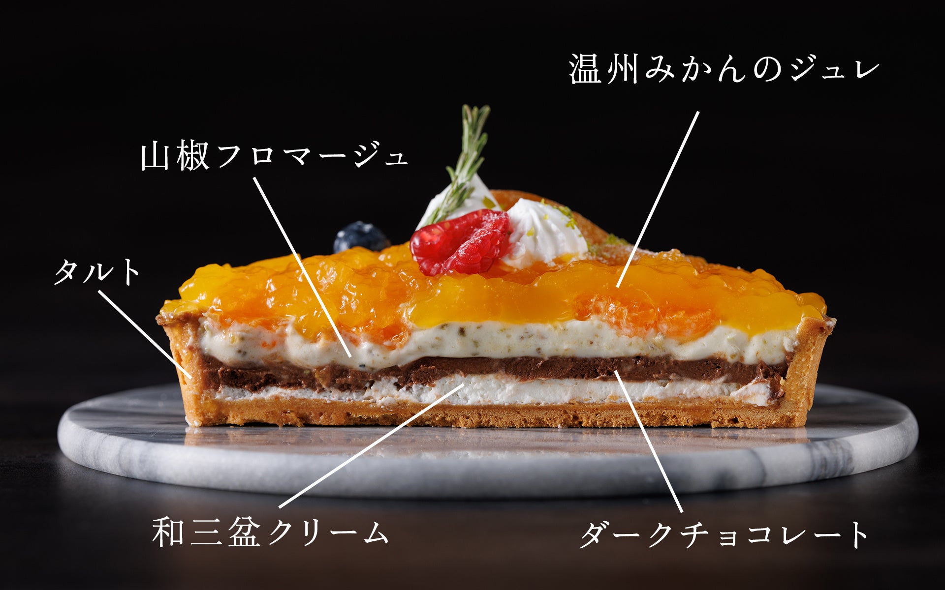 サクサクのタルト生地に、やさしい甘さの和三盆クリーム、濃厚なショコラムース、ピリッと効いた山椒フロマージュを重ねました。仕上げに瑞々しい温州みかんのジュレをあしらい、甘みと爽やかさ、スパイシーなアクセントが織りなす奥行きのある味わいをお楽しみください。