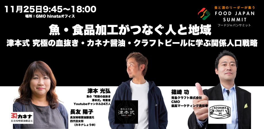 登壇:津本 光弘(津本式究極の神経絞め考案者/長谷川水産)、長友 陽子(カネナ醤油)、篠崎 功(青島クラフト)