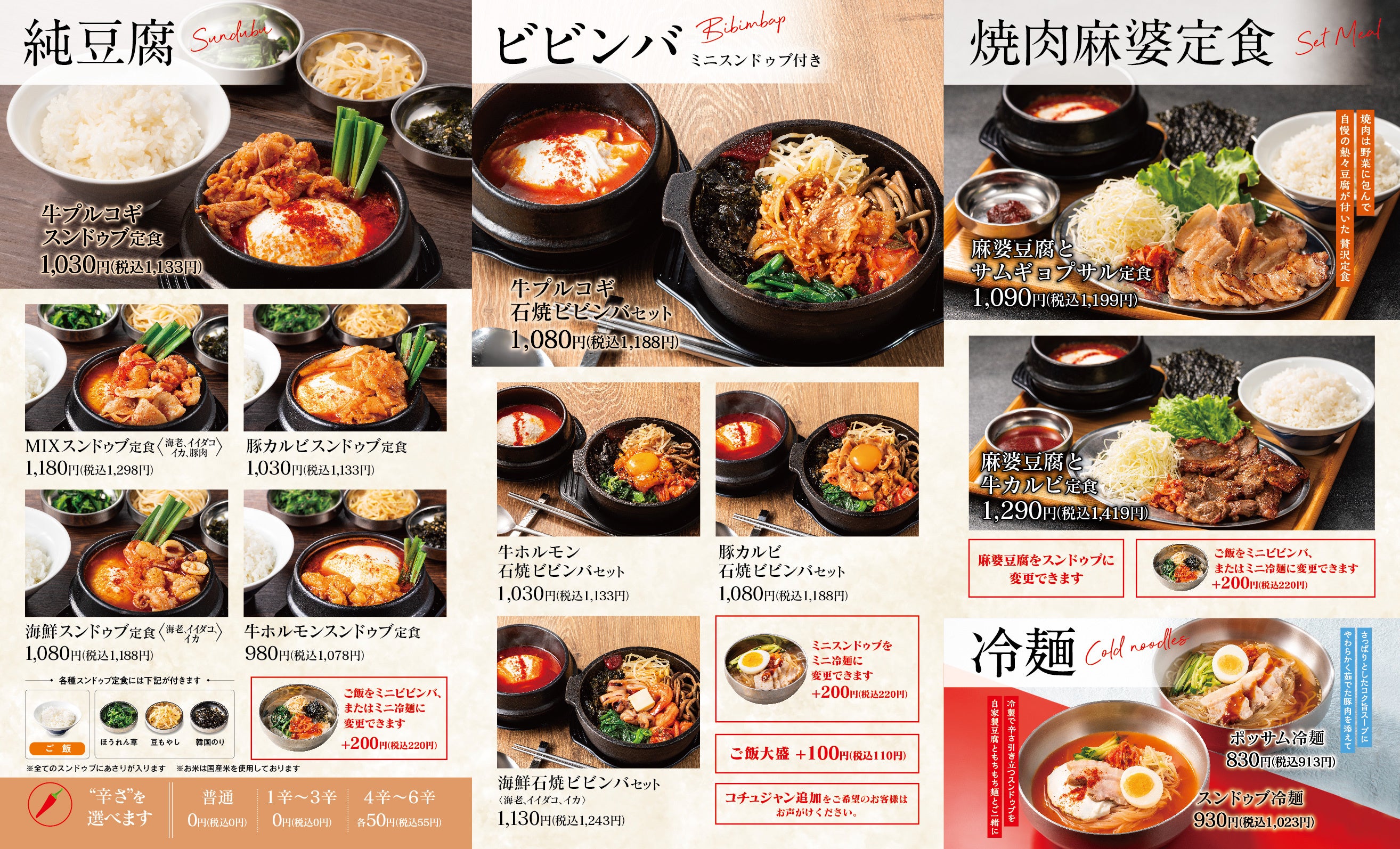 また、定食の麻婆豆腐は「ミニスンドゥブ」に、ご飯は+220円(税込)で、ミニビビンバもしくはミニ冷麺へ変更可能です。
