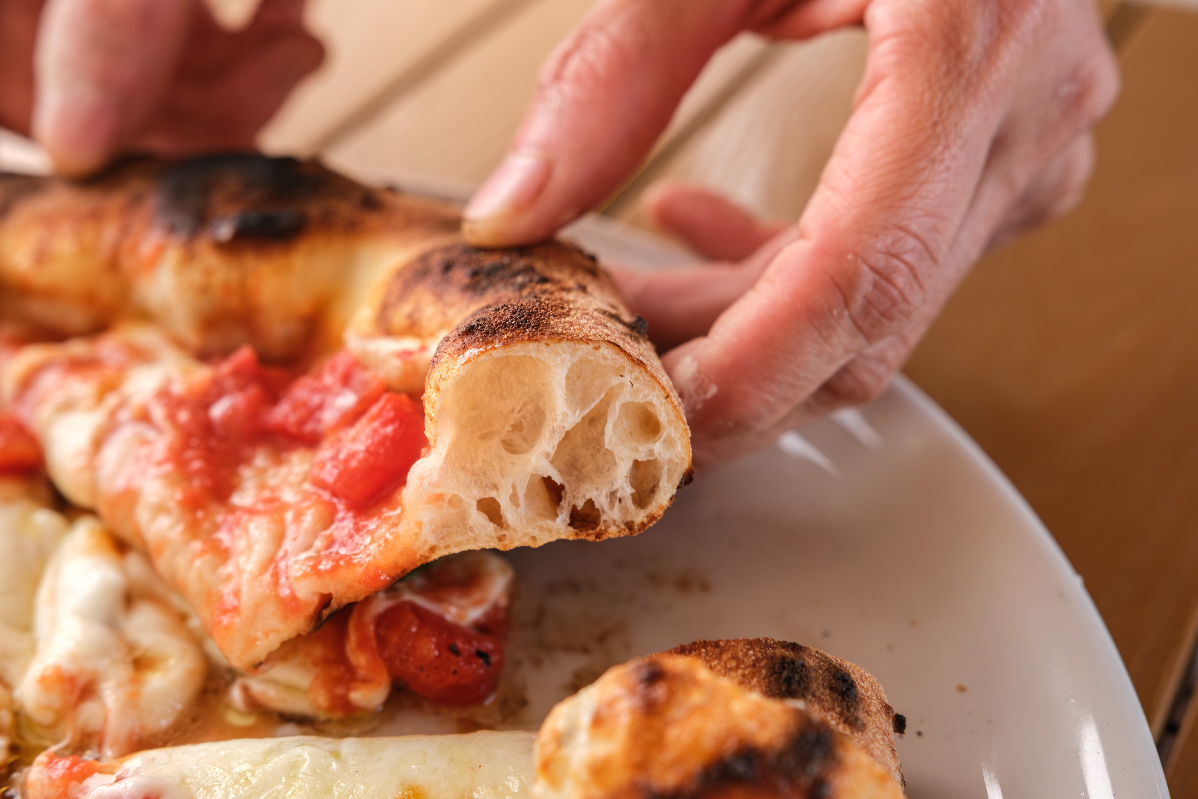 グルメ媒体:高加水生地/400℃石窯の焼成工程/オリジナルピッツァ/コンテンポラネア生地。