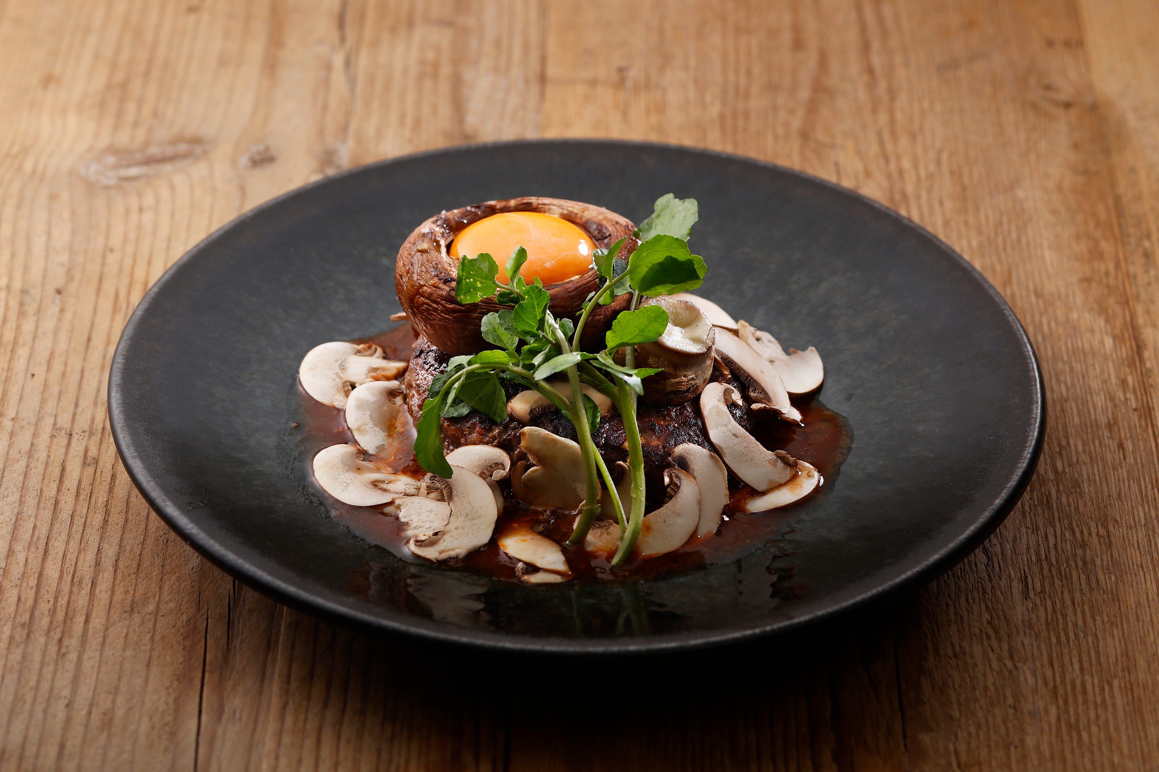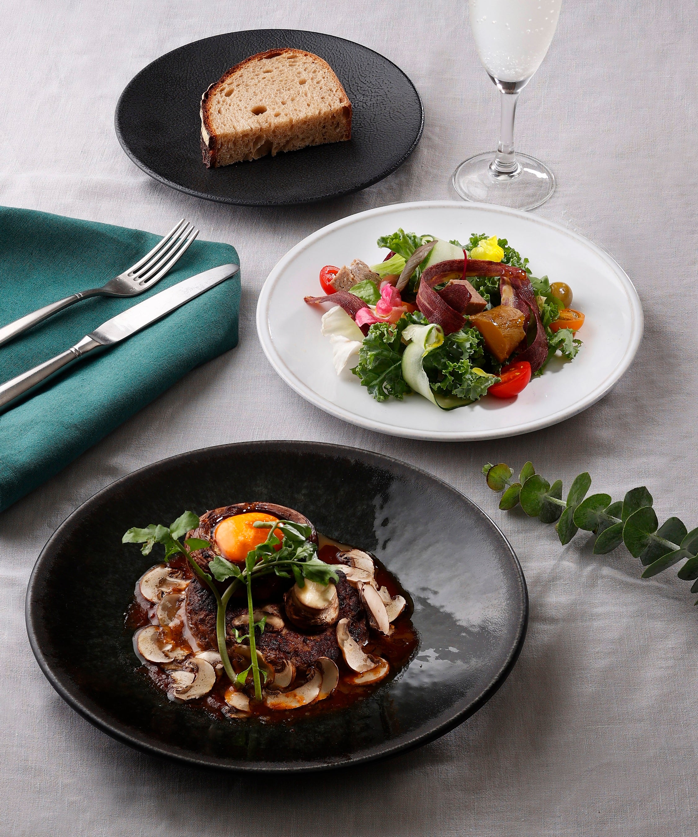 ビーフを100%使用したハンバーグに合わせるのは酸味とコクが特徴のトマトドミグラスソース。丸ごと1個使用したジャンボマッシュルームには卵黄を合わせ、ホワイトマッシュルームとトリュフオイルが香る一品。