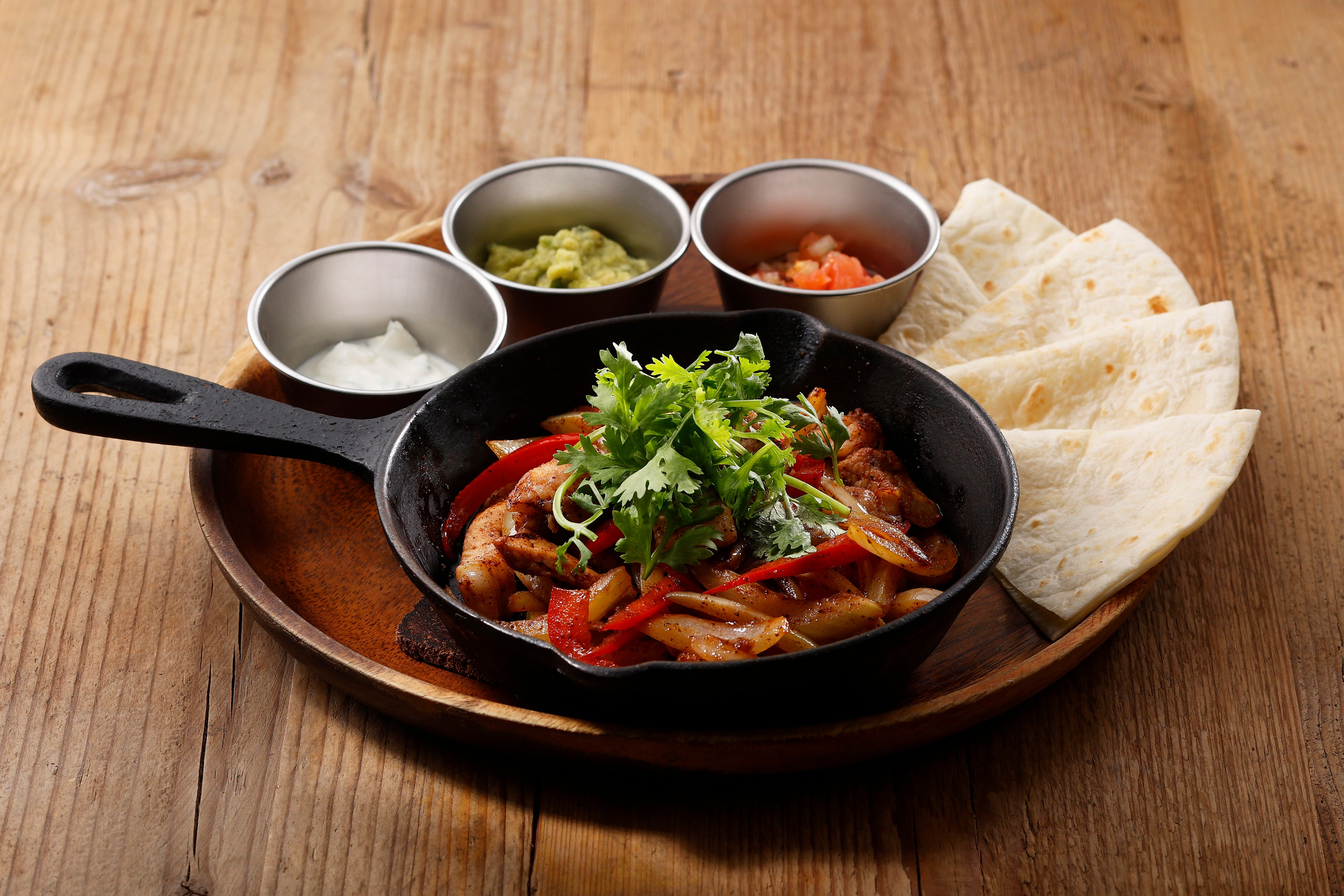 スパイスでマリネした国産ポークを細切り野菜とソテーし、トルティーヤに包んで食べる一品。ヨーグルトソース、ワカモレ(アボカドソース)、サルサソースの3種のソースをお好みの組み合わせでお楽しみください。