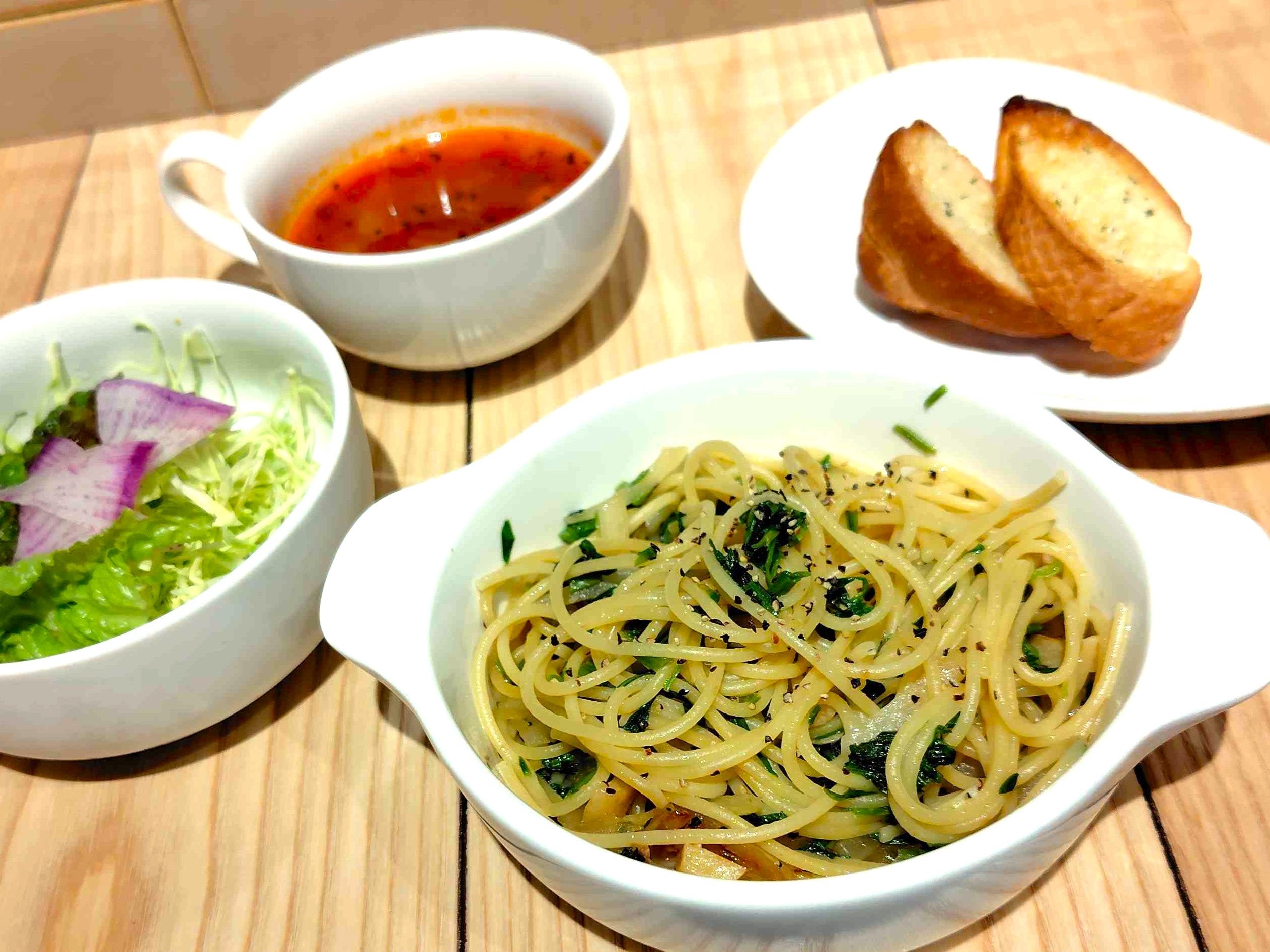 そして、カフェのランチメニューにも野菜や大豆製品などのヘルシーな素材がたっぷり使われています。多くのメニューで肉の代わりに大豆ミートやうす揚げなどを活用していますが、丁寧な下ごしらえによりお肉と変わらない食感や食べごたえに仕上がっています。オイルやチーズも植物性のものを使っているためか、お客様からは「ドリアを食べても胃が重く感じない」といった声も。長年カフェで経験を積んできた料理人が試作を重ねレシピを色々と工夫したことで、優しいけれどしっかり滋味を感じられる味わいと、日本らしい素材をメインにしつつも洋食らしさを楽しめるメニューが揃いました。