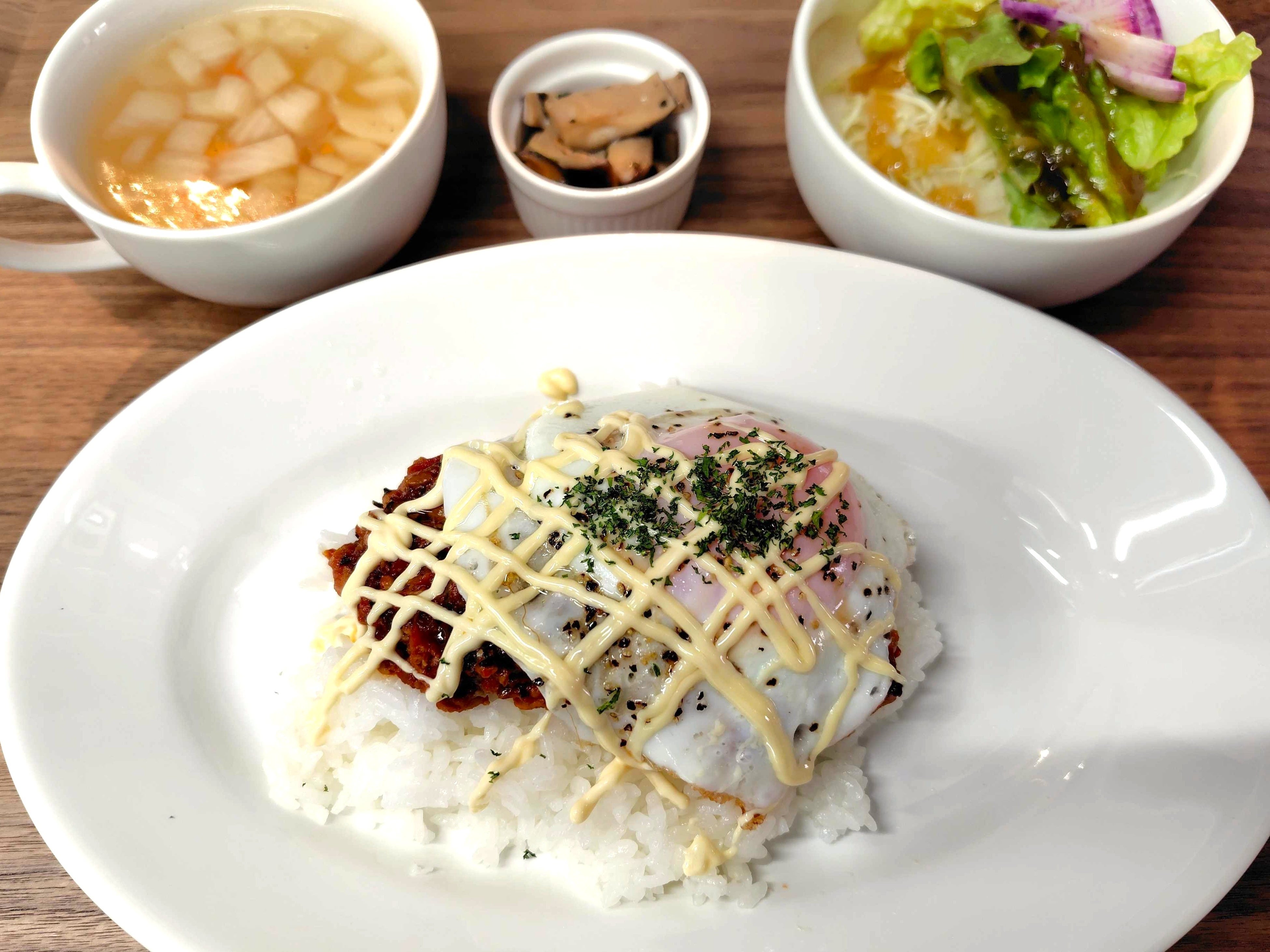 Hearn(ハーン)バーグライス・野菜の副菜・野菜スープ・野菜サラダ・豆乳アイスクリームがセットになったHearn(ハーン)バーグランチ。メインのHearn(ハーン)バーグライスは、カレー味のライス、鶏ひき肉と豆腐のハンバーグ、八雲の好物だった目玉焼きが三段重ねになった食べ応えたっぷりの一品です。割りながら一緒に食べることができる、八雲の愛した帽子ものっています。デザートの自家製豆乳アイスクリームは、コクのある味わいながらやさしい甘さと軽い舌ざわりで、すんなりと別腹におさまります。