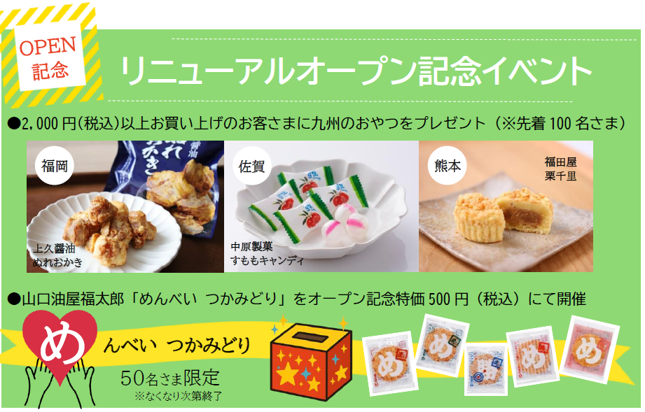 定商品や、新たな九州の定番土産など豊富な商品を取り揃えます。観光客の方はもちろん、地域の