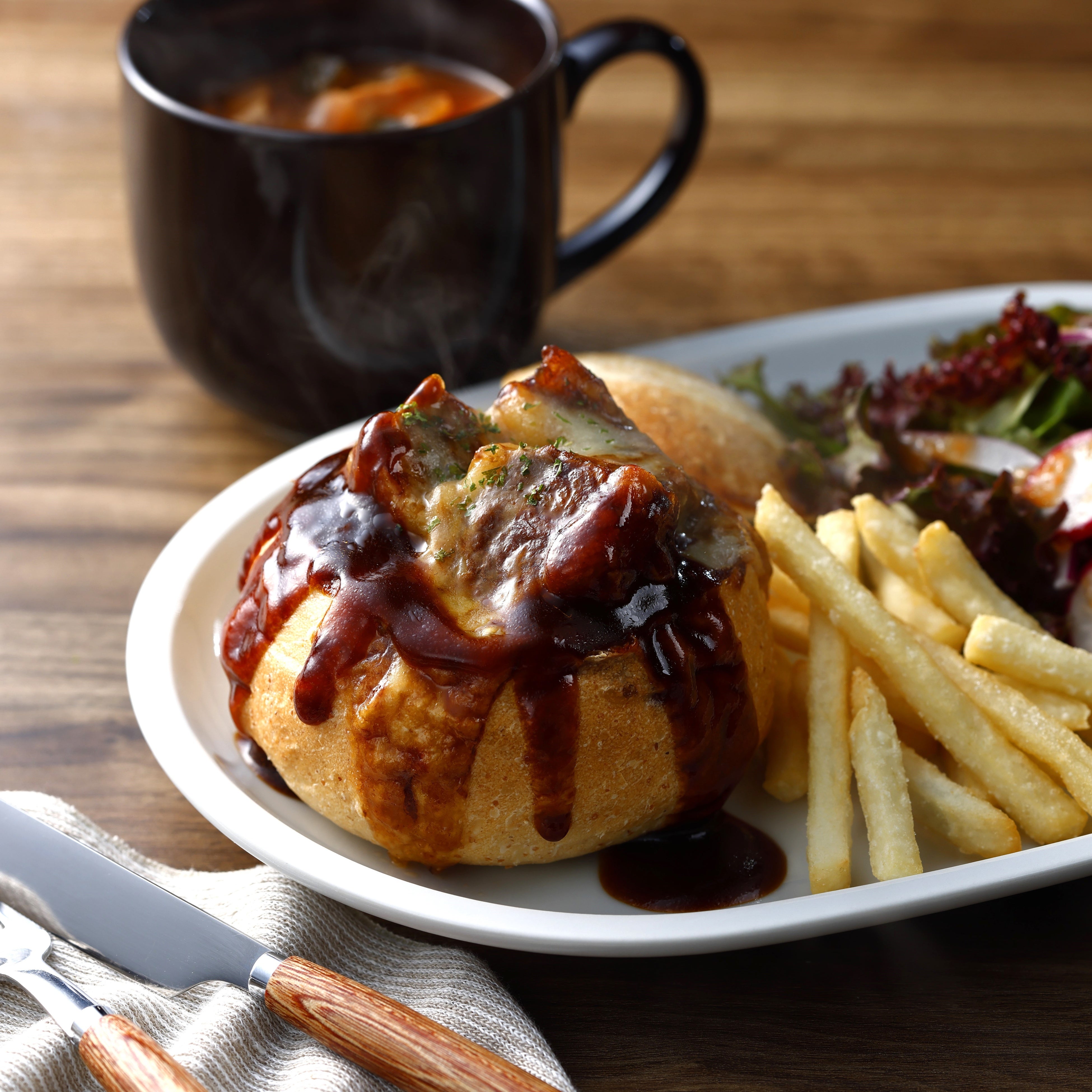 味わい深いビーフシチューを器に見立てたパンと一緒に楽しめます。選べるスープ付きです。