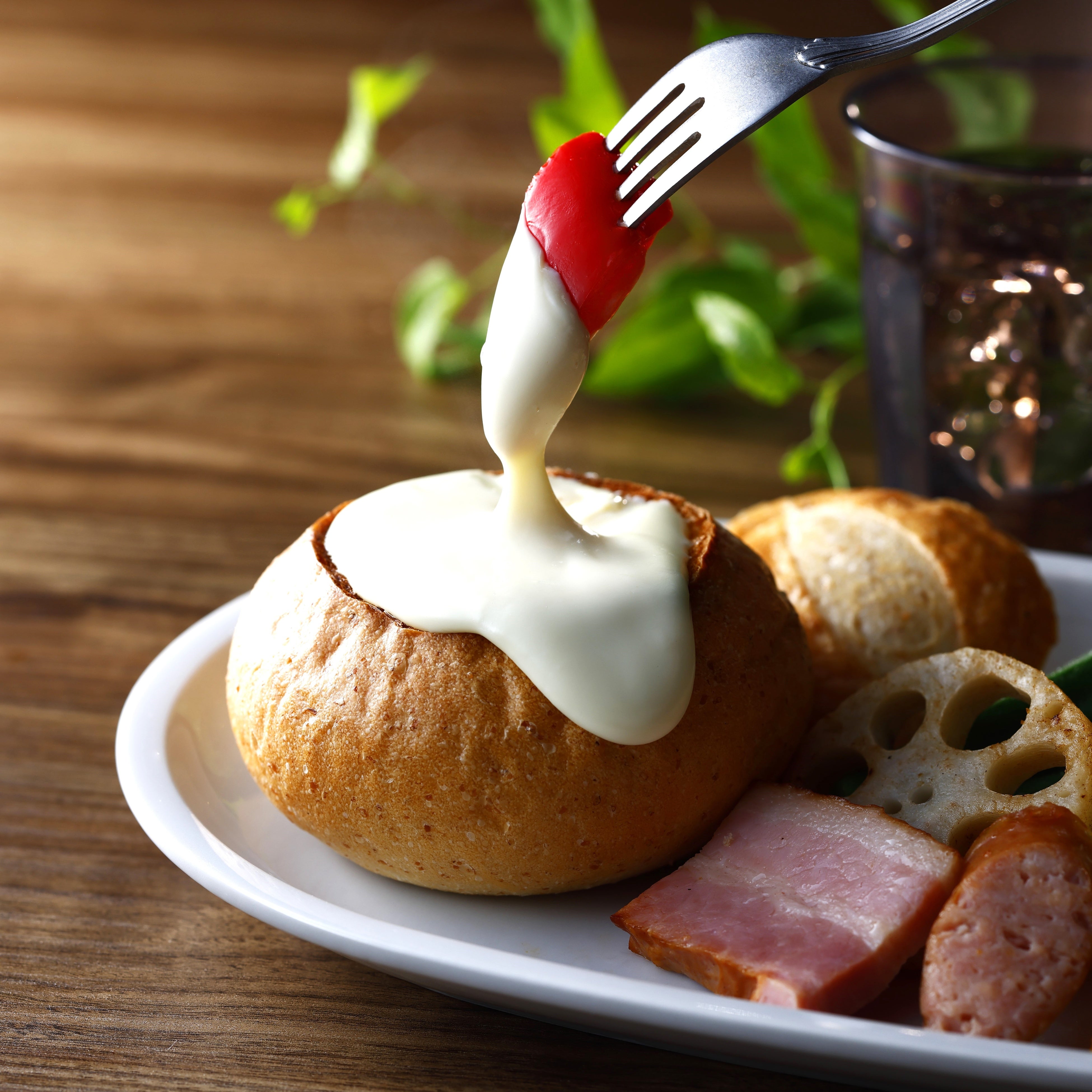 季節の野菜やパンを国産の白ワインの風味を生かしたチーズフォンデュソースで味わう一品です。