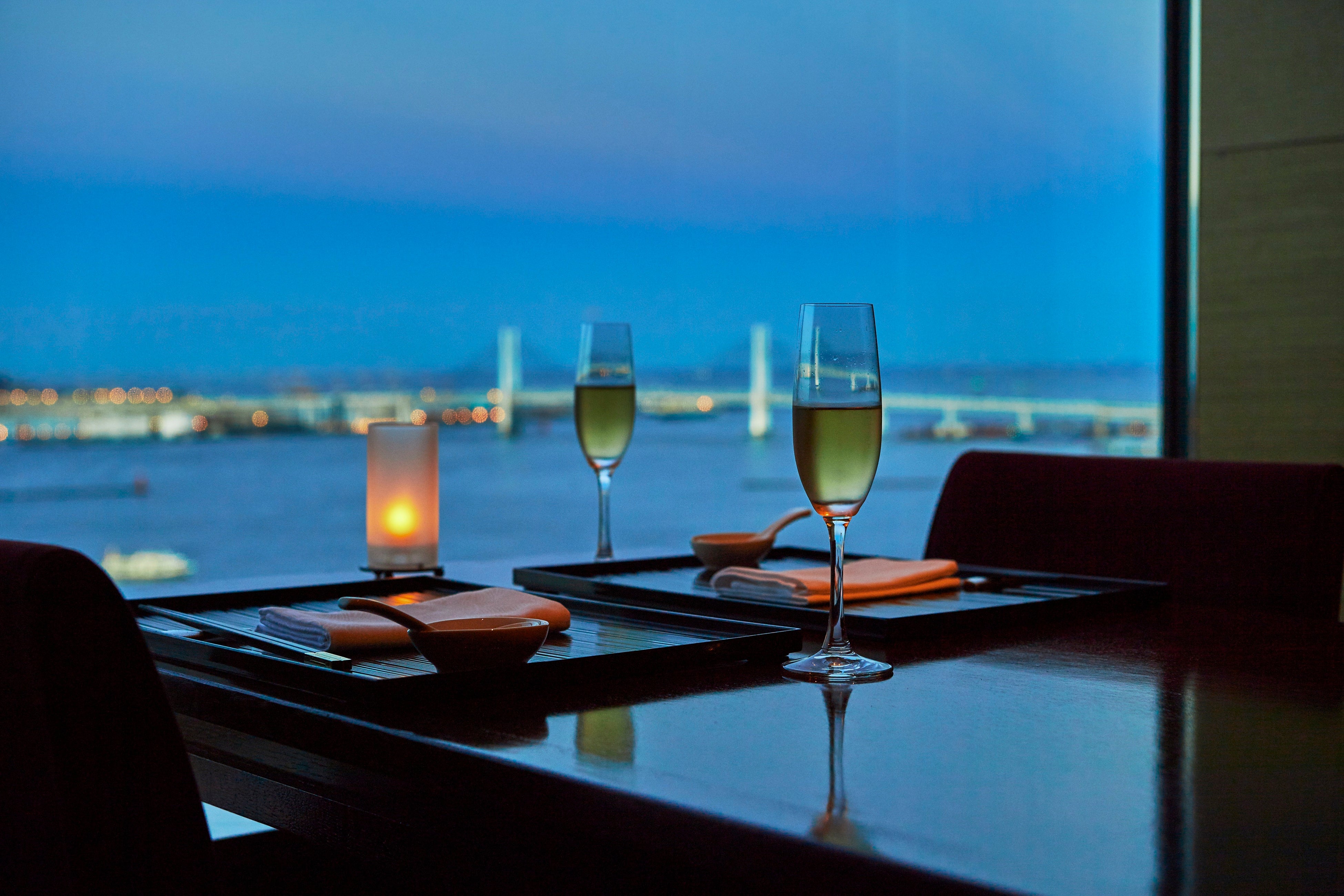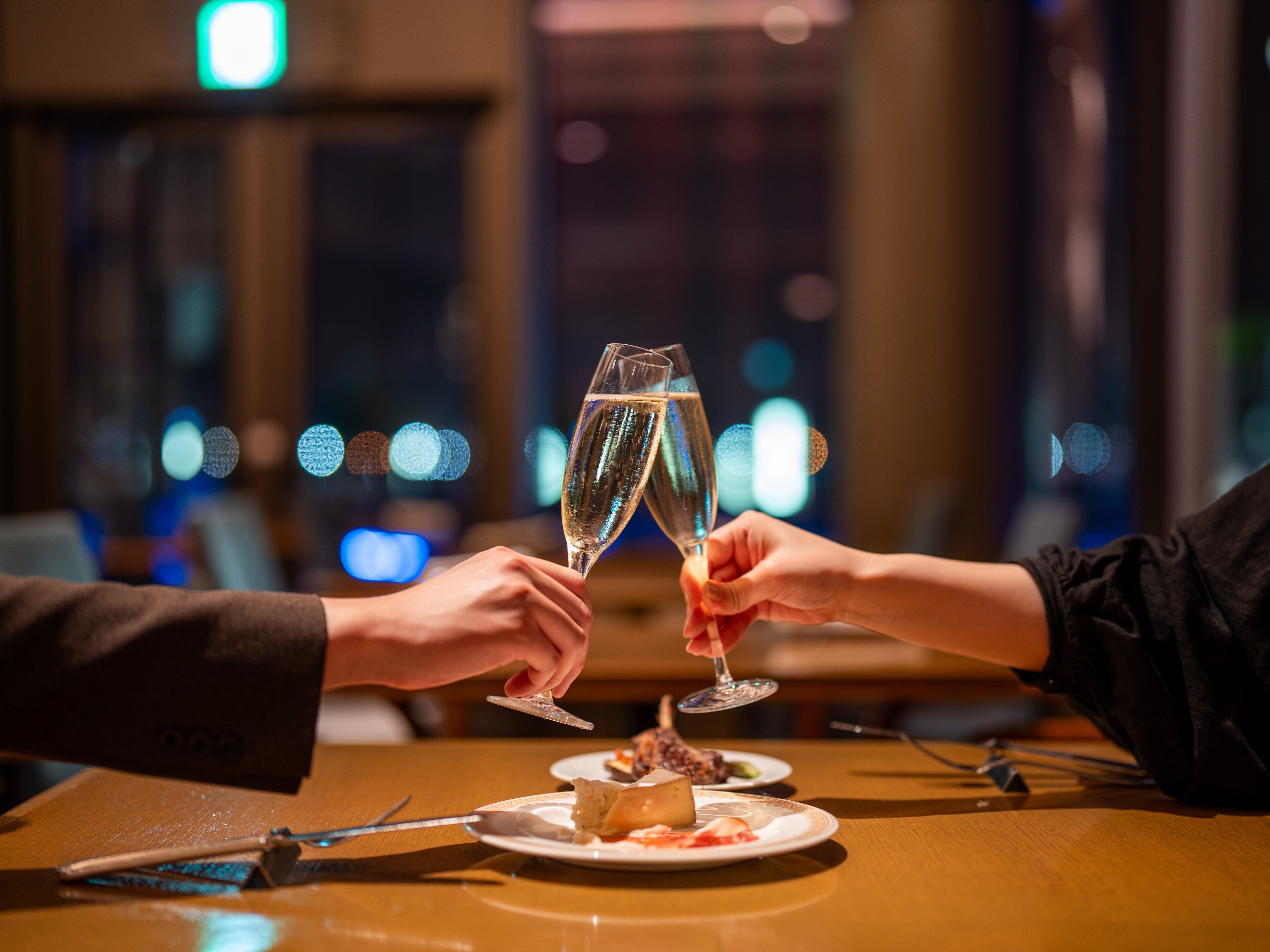 海上ならではの波のリズムを感じながら、パンチェッタを巻いたアンコウのローストや、黒毛和牛のパイ包み焼きなど、ホテル自慢の料理の数々をお楽しみいただけます。店内に流れる音楽と窓から見えるイルミネーションが、おふたりの時間をより一層ロマンティックに演出します。
