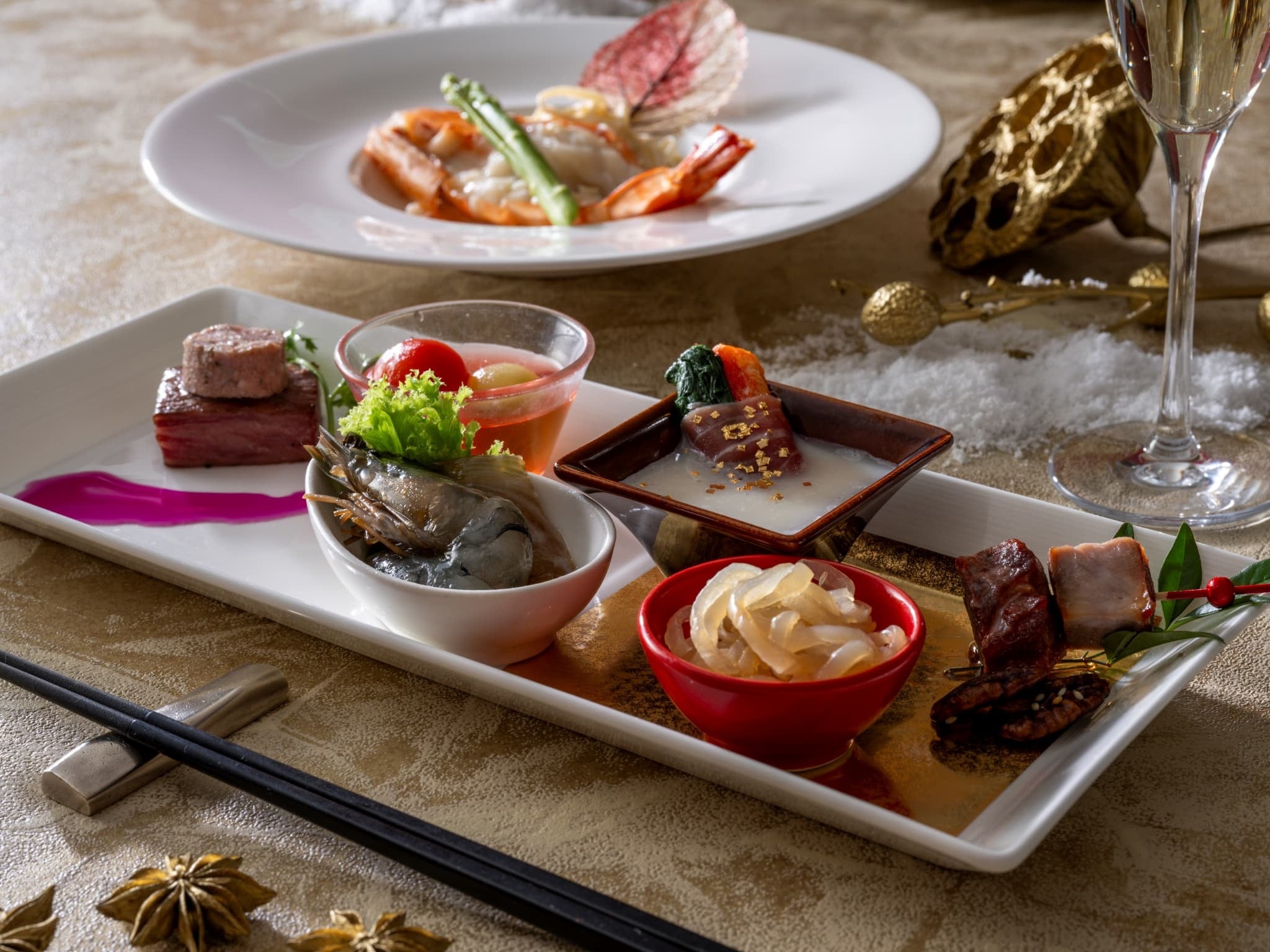 ホテル最上階のメインダイニング 中国料理「驊騮(カリュウ)」では、色とりどりの前菜盛り合わせやフカヒレが丸ごと入った蒸しスープ、山形牛サーロインと高級魚ハタを組み合わせたメインディッシュなどの全6品に、グラスシャンパンとオリジナルの中国茶が付いた豪華絢爛なクリスマスディナーコースをご用意しました。