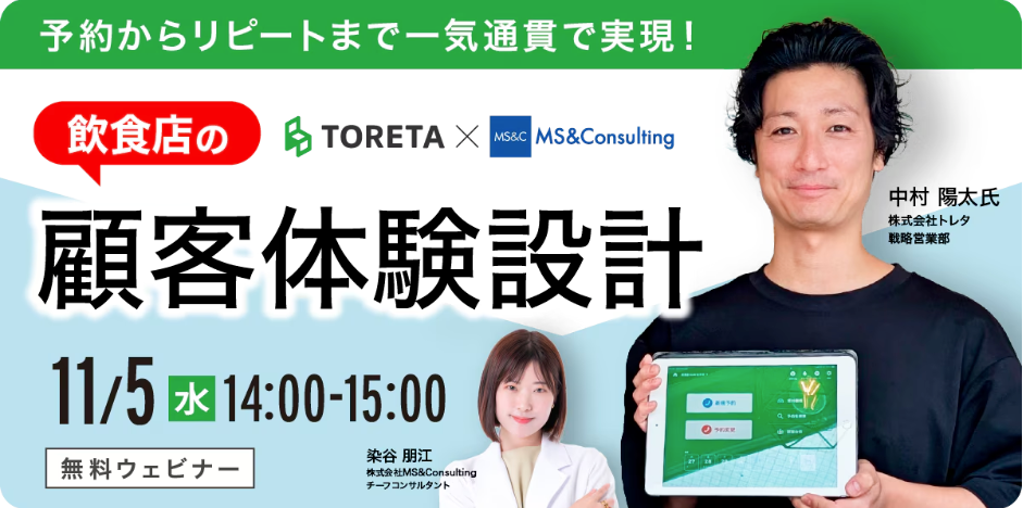株式会社トレタ(本社:東京都渋谷区、代表取締役 CEO:中村 仁)と株式会社MS&Consultingは、2025年11月5日にオンラインにて「予約からリピートまで一気通貫で実現!最新・顧客体験設計」セミナーを共催で開催いたします。飲食店向け予約・顧客管理システムを提供する株式会社トレタと、顧客体験の改善とリテンション支援を専門とする株式会社MS&Consultingが、予約から再来店までを一気通貫で強化する最新の顧客体験設計の実践手法をご紹介いたします。