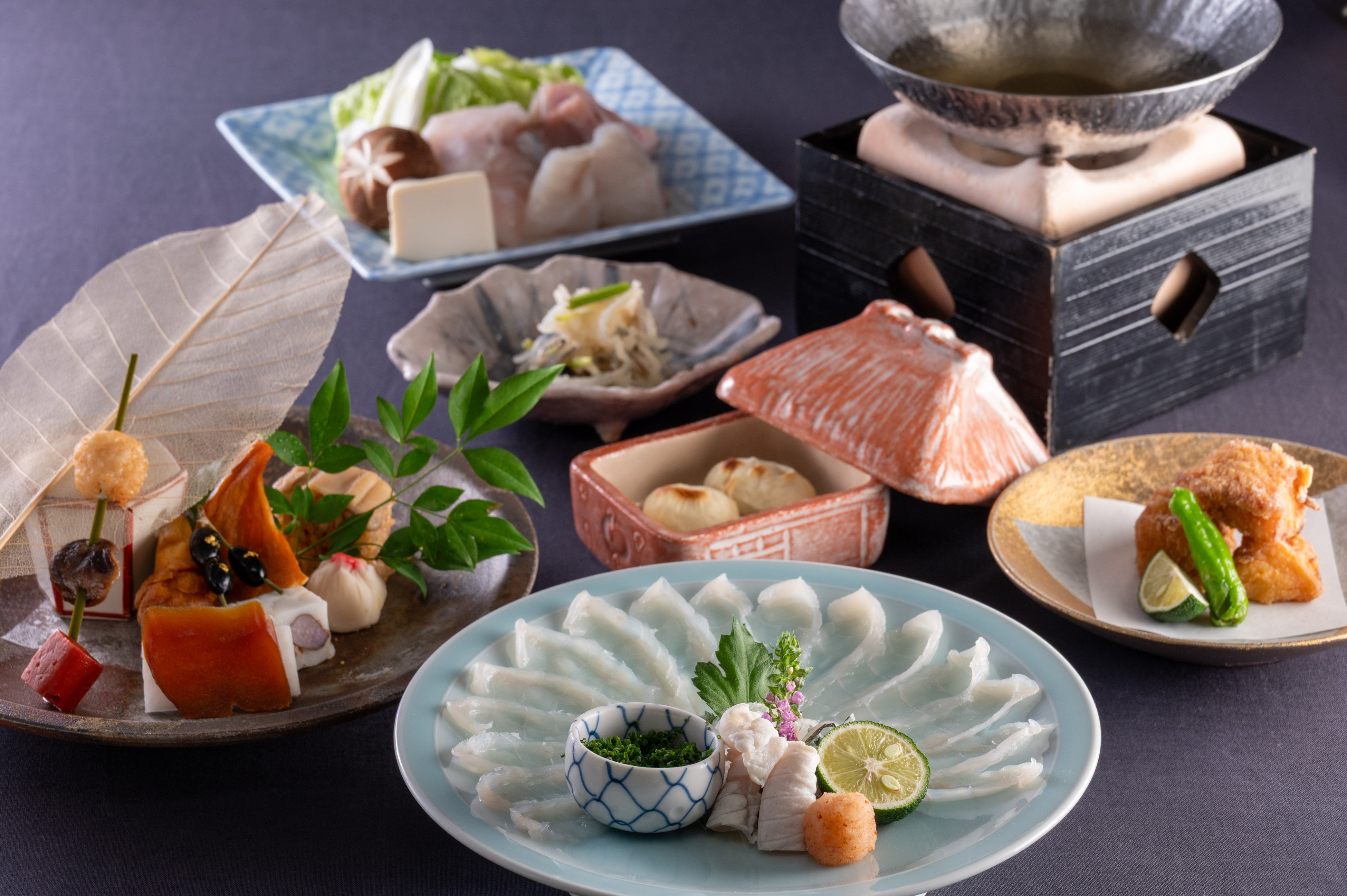 「とらふぐ会席」では、冬ならではのメニュー「ふぐちり」や、ふぐ料理の定番「てっさ」「白子焼き」「唐揚げ」「ふぐ雑炊」など、様々な調理法で旬のふぐをご堪能いただけます。