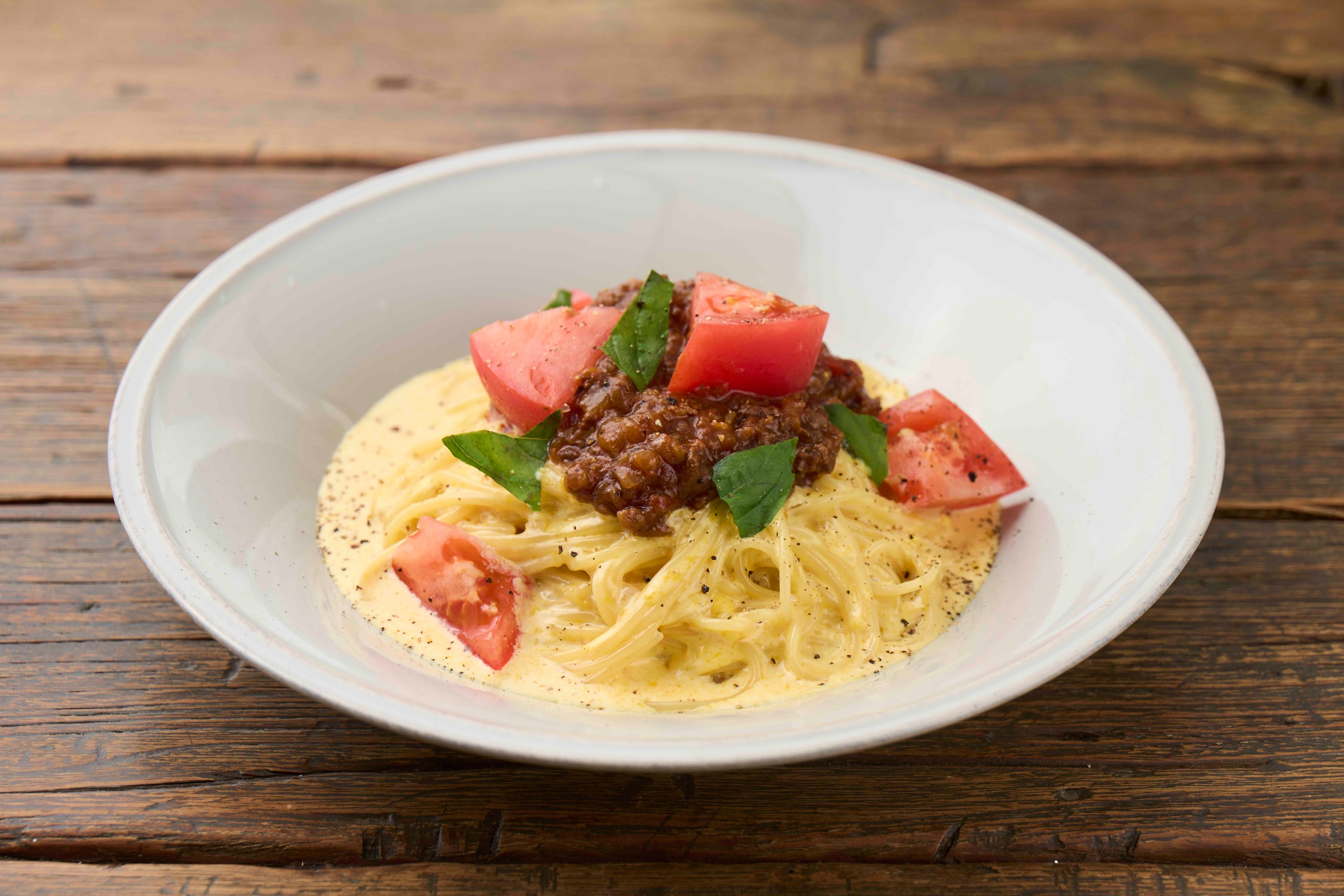 メニュー名:卵のカルボナーラとひき肉、フレッシュトマトとバジルの香りを添えて