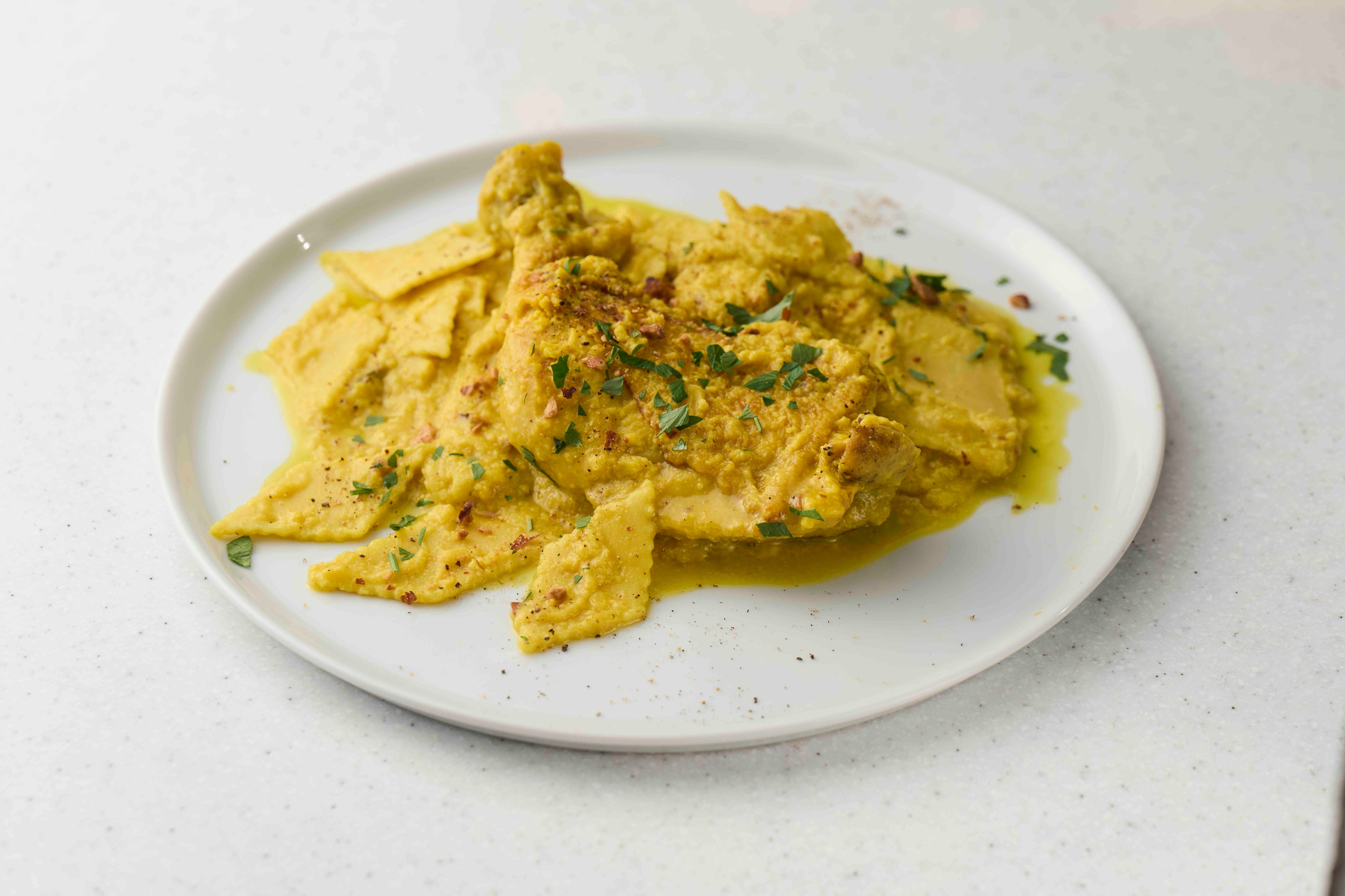 鶏もものアーモンドと 卵のソースタッコーニ