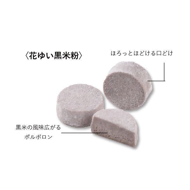 口の中で溶ける前に❝ポルボロン❞と3回唱えると願いが叶う❝幸せを呼ぶお菓子❞に、黒米粉を入れて焼き上げました。ほろっとほどけるような口どけに、黒米の香ばしい風味が広がり、黒米本来の美味しさが楽しめます。